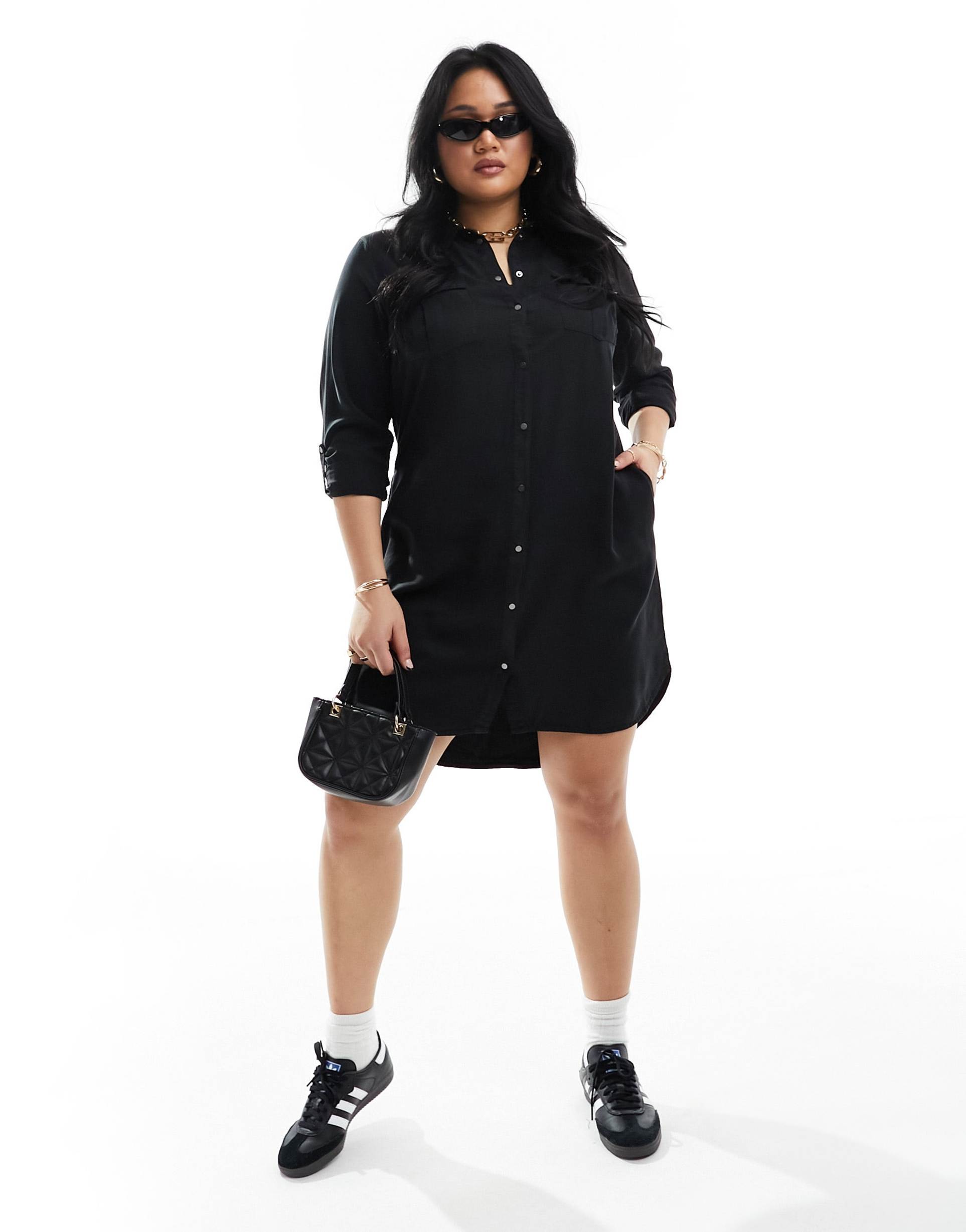 A matte black denim shirt dress crafted from non-stretch lyocell denim offers a casual chic silhouette with a regular fit and a mini length hem. Featuring a classic shawl collar and practical snap button placket, it combines style and ease. The three-fourth length sleeves and functional front pockets enhance comfort and utility. Perfect for everyday wear, streetwear, or casual outings, this Vero Moda Curve piece brings laid-back sophistication to your wardrobe with clean lines and a versatile finish.