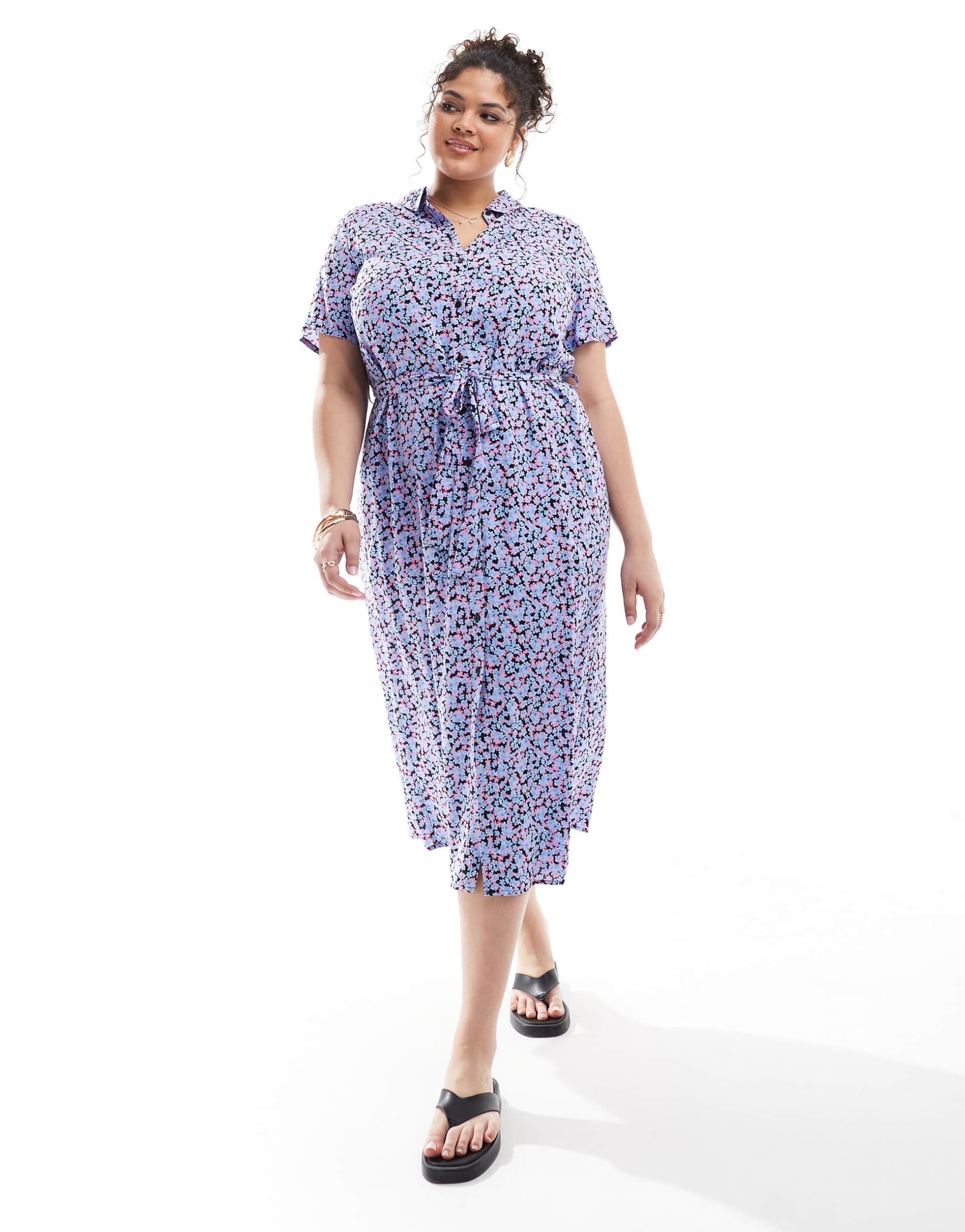 Effortless, breezy elegance for sunlit weekends. This Vero Moda Curve shirt dress in a delicate blue floral print is crafted in lightweight, drapey viscose, giving a soft, fluid fall. The midi-length silhouette sits in a regular fit with a spread-collar, a front button-down placket, and a self-tabric belt that cinches the waist for a flattering shape. Short sleeves keep it cool, while the all-over floral pattern on a pale base radiates fresh, feminine charm. Dress it up with sandals for a casual brunch, or pair with wedges for vacation-ready polish. A versatile piece that transitions from day to night with ease.