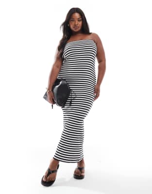 VERO MODA CURVE RIBBED JERSEY STRAPLESS MAXI DRESS IN BLACK AND WHITE STRIPES