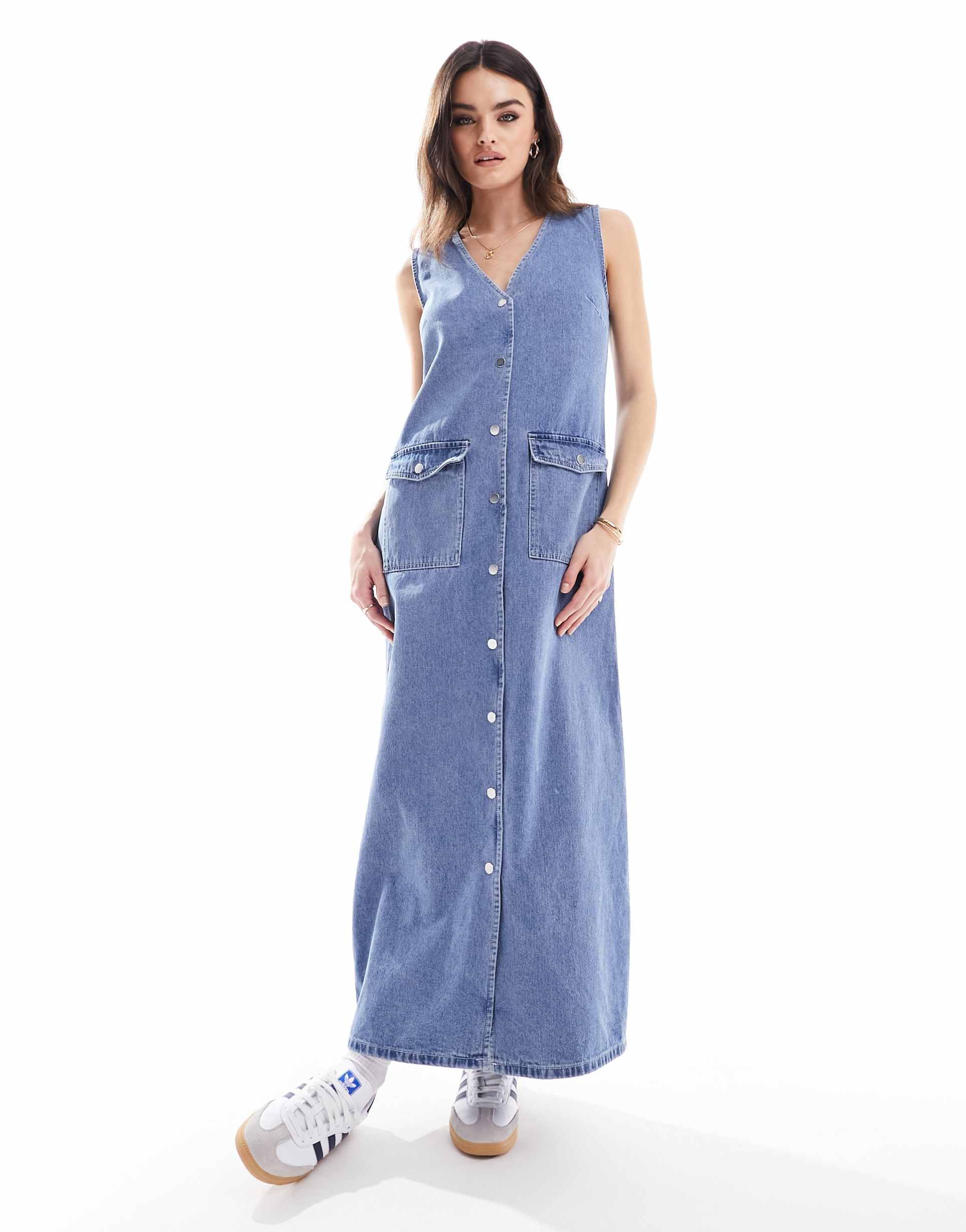VERO MODA DENIM SLEEVELESS BUTTON THROUGH MAXI DRESS IN BLUE