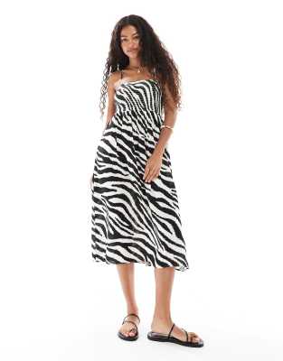 Bold zebra stripes define this midi camisole dress featuring a shirred, stretch bodice that offers a regular fit and adjustable straps for comfort. The off-shoulder neckline and sleeveless style create an effortlessly chic silhouette, perfect for summer outings. Crafted from lightweight viscose, it drapes softly while maintaining breathability. Its versatile design suits casual days, brunch dates, and relaxed evening wear, combining trendy animal print with comfortable style.