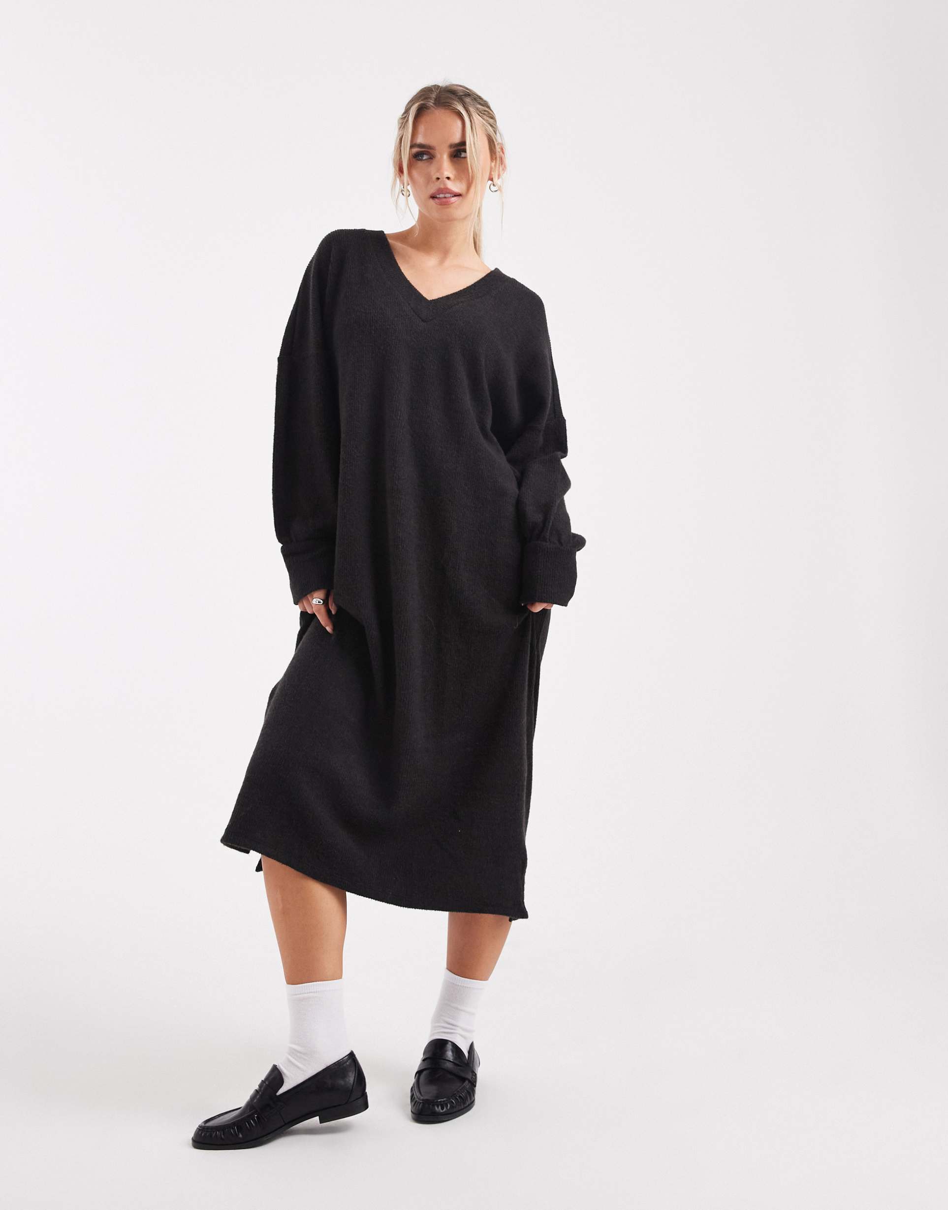 VERO MODA PETITE SOFT RIB KNIT V-NECK MIDI DRESS IN BLACK