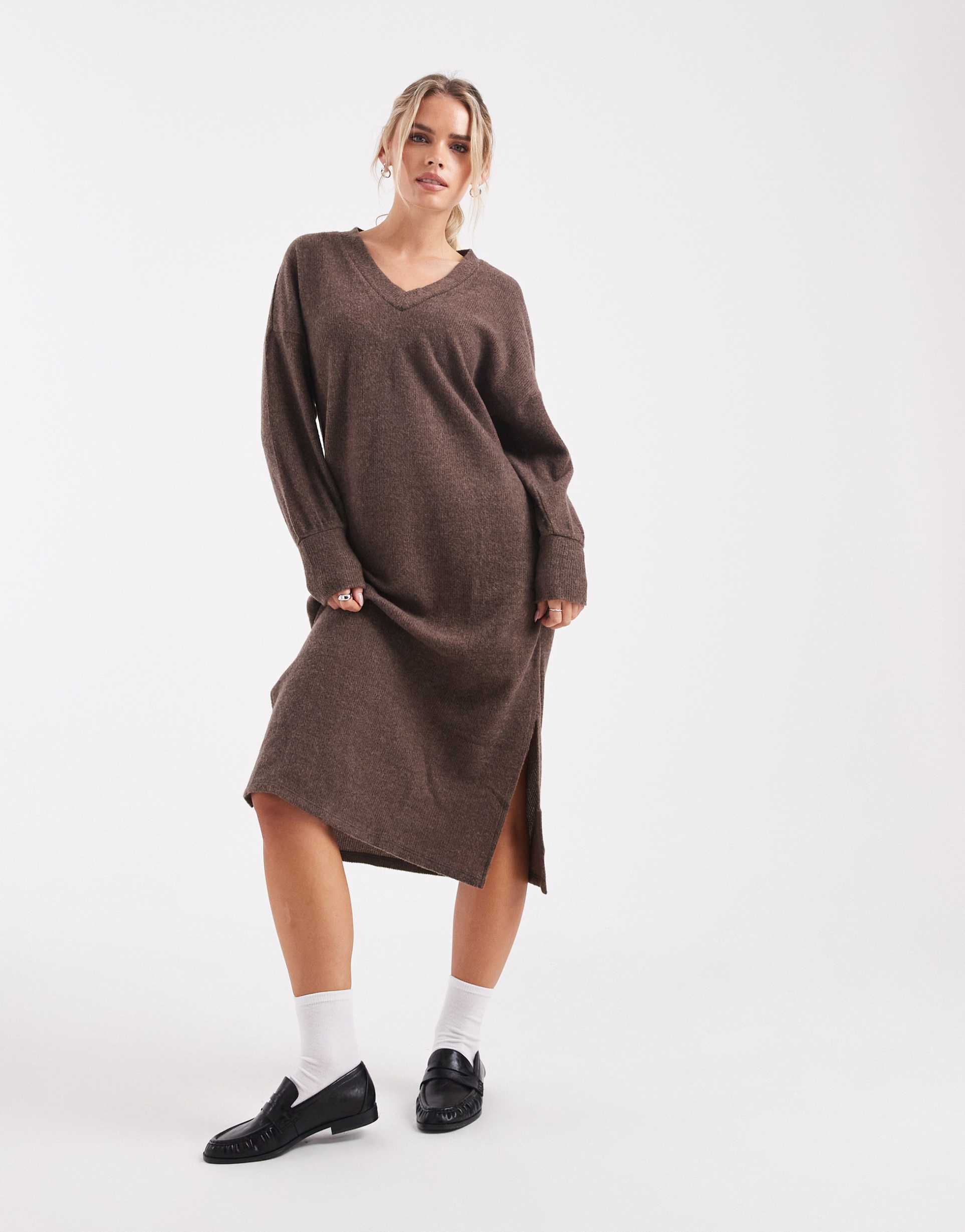 VERO MODA PETITE SOFT RIB KNIT V-NECK MIDI DRESS IN HEATHERED CHOCOLATE