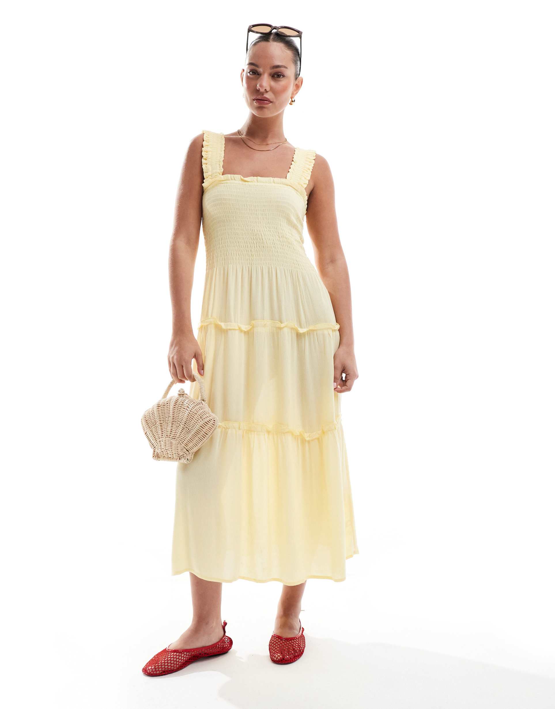 Soft, lightweight viscose drapes beautifully in this pale yellow midi dress featuring a square neckline and sleeveless, strap-style shoulders. The regular fit and A-line silhouette are complemented by delicate ruffle layers along the hem, creating a romantic yet casual chic vibe. Ideal for spring and summer occasions like brunch, casual outings, or date nights, this breathable cami dress offers effortless style with a slip-on closure. Its matte finish and layered hemline add subtle texture and movement, making it a versatile wardrobe staple for warm weather events.