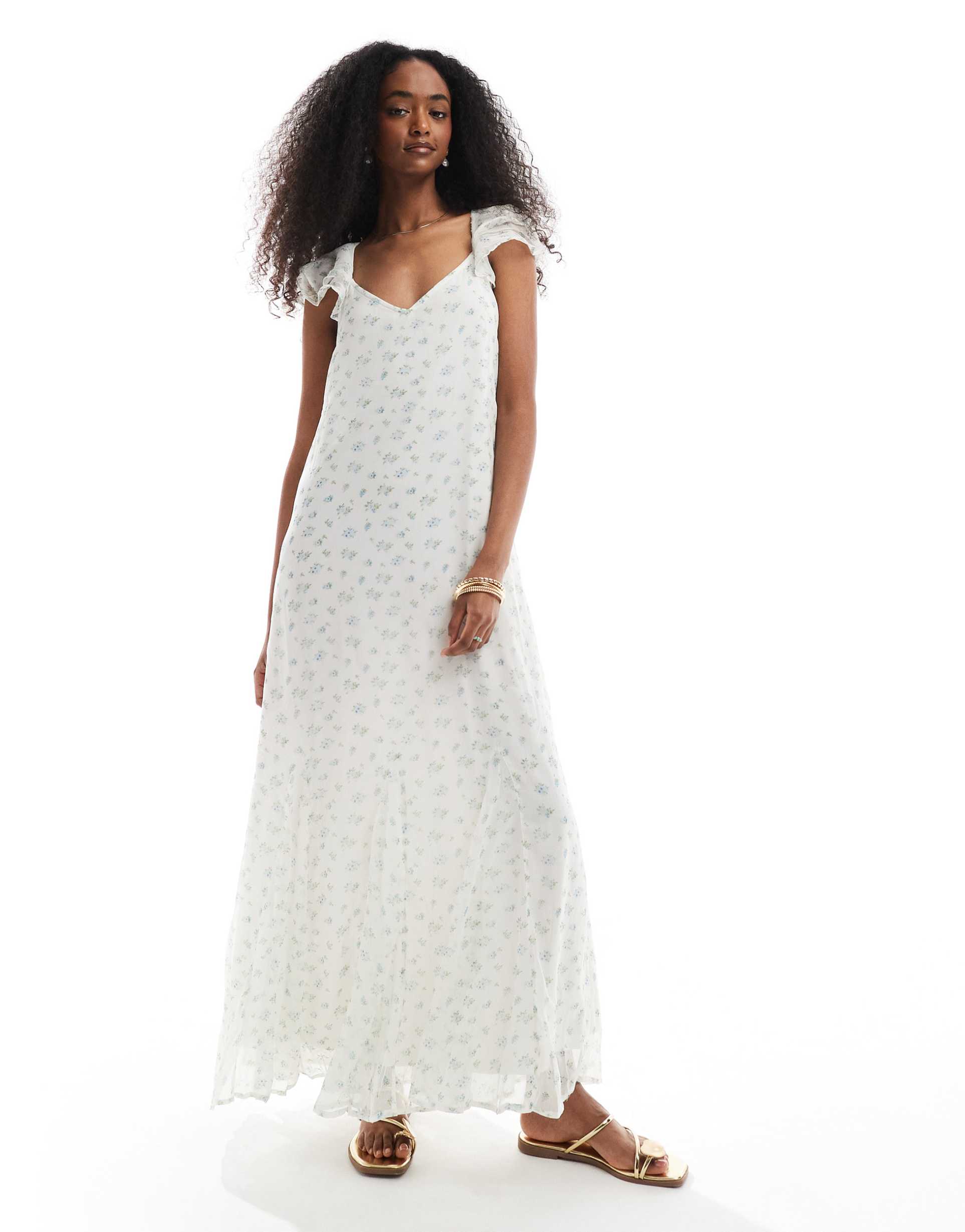 Soft chiffon fabric and a romantic shift silhouette flow gracefully to the ankle in this white dress adorned with delicate blue micro floral prints. The flutter sleeves and V-neckline enhance its airy and feminine appeal, while the tie-back fastening offers a subtle decorative detail and adjustable fit. Perfect for spring and summer occasions, this regular fit maxi is ideal for casual outings, brunches, and date nights, combining comfort and elegance with its sheer texture and classic charm.