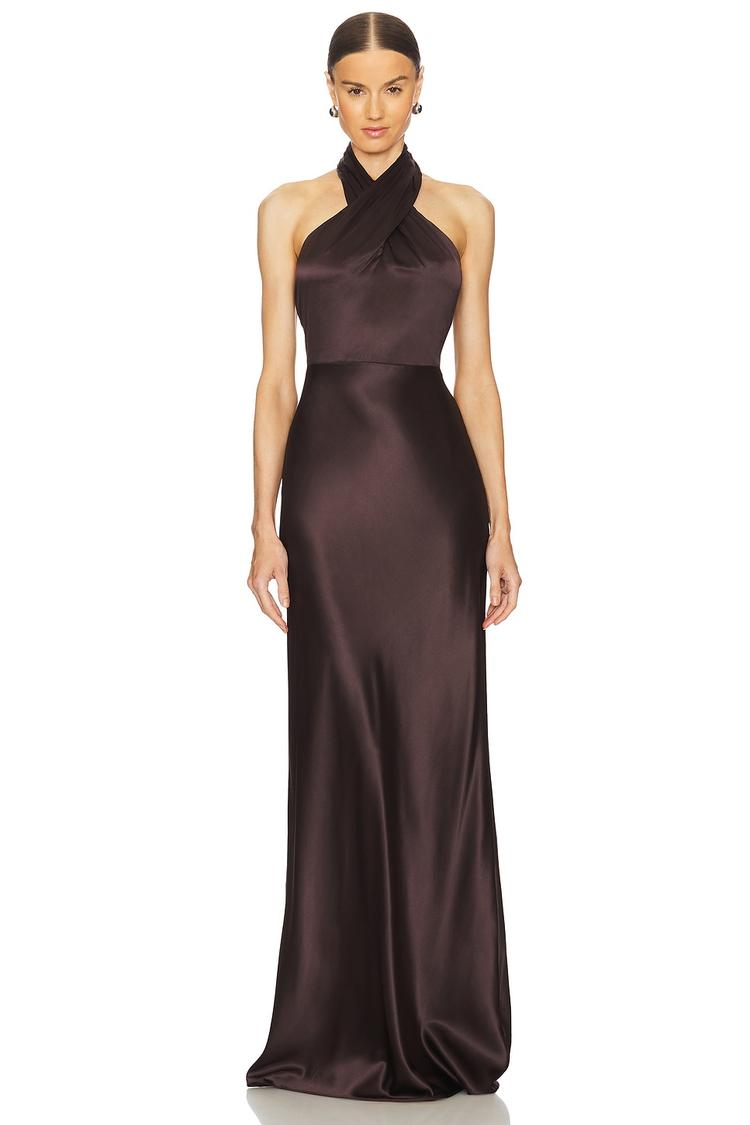 A sleek column silhouette in matte dark brown satin exudes timeless sophistication. The halter neck with button closure and a fitted bodice create an elegant shape, complemented by a clean maxi hem that flows gracefully. Crafted from a luxurious blend of silk, viscose, and polyester, this lightweight satin gown offers both comfort and style. Ideal for cocktail parties, formal events, and romantic date nights, it blends classic charm with modern elegance, making it a versatile choice for any refined occasion.