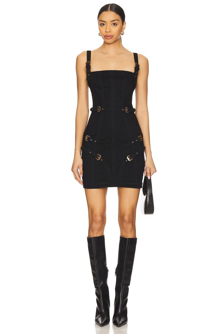 A sleek black shift silhouette crafted from heavyweight denim with a touch of elastane ensures a fitted yet comfortable wear. This mini dress features a modern square neckline and sleeveless wide straps with adjustable gold-tone buckles, complemented by front gold buckle accents and a gold zip back closure. Its chic design is perfect for night outs, cocktail parties, or date nights, combining bold details with versatile comfort. The clean hemline and structured fit create a statement piece made in Italy for a confident, contemporary look.