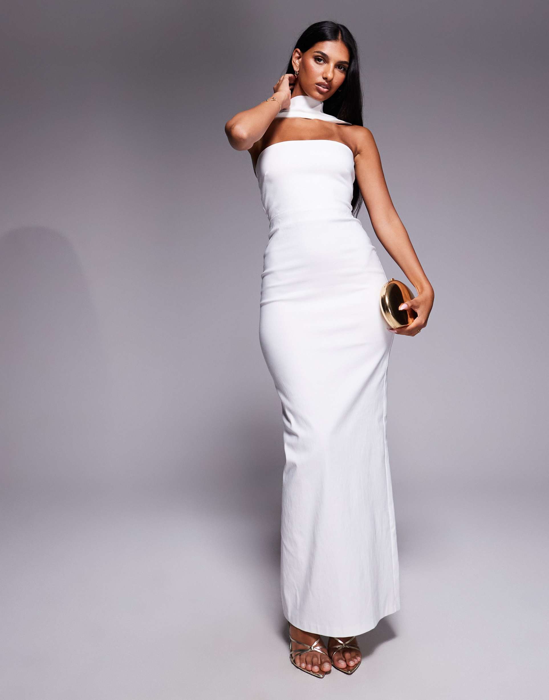 VESPER BENGALINE BANDEAU CHOKER DETAIL BACK TRIM MAXI DRESS IN WHITE