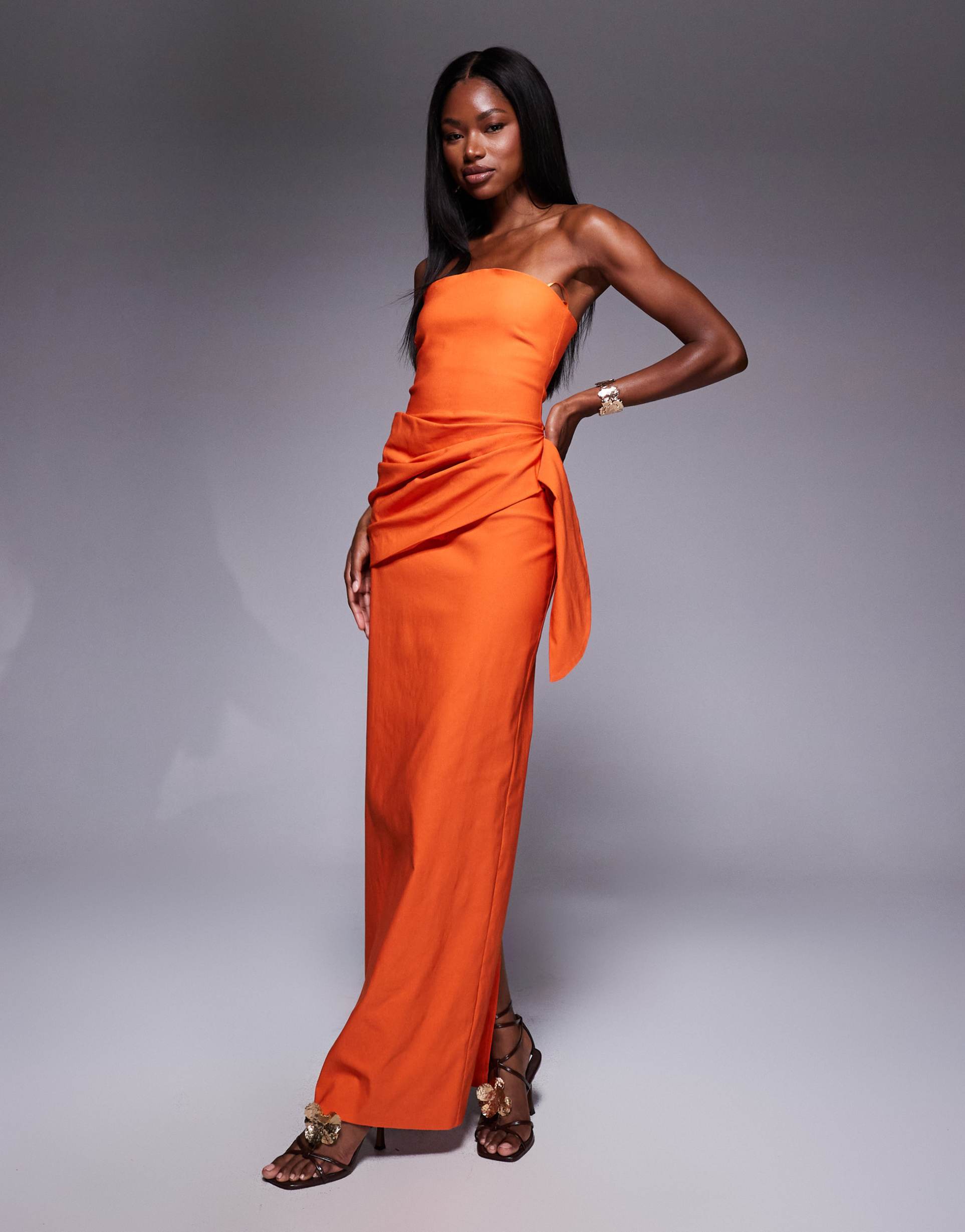 VESPER BENGALINE BANDEAU DRAPE FRONT DETAIL MAXI DRESS IN ORANGE