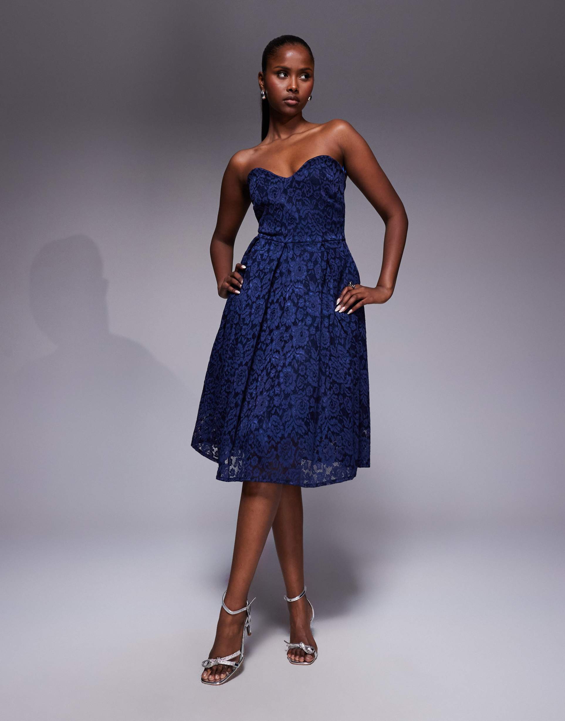 VESPER LACE PLEATED SWEETHEART MIDI DRESS IN NAVY