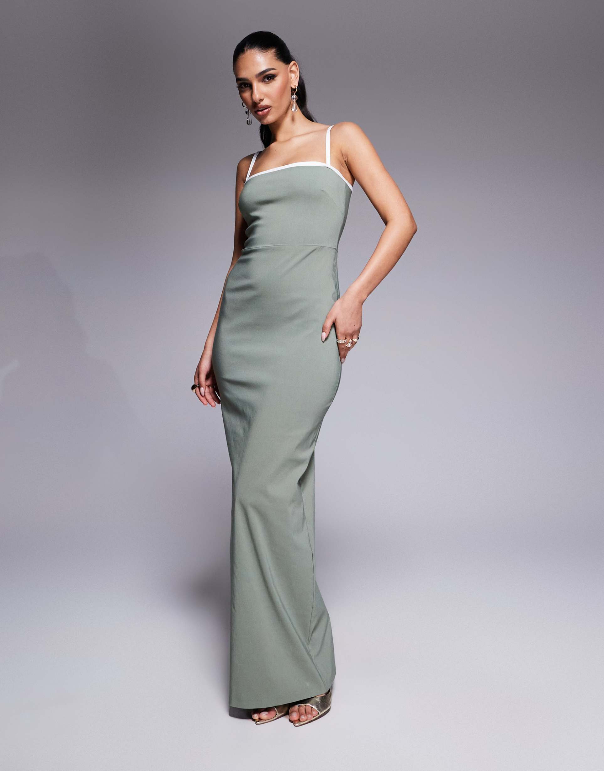 VESPER SQUARE NECK CONTRAST PIPING BODYCON MAXI DRESS IN SAGE