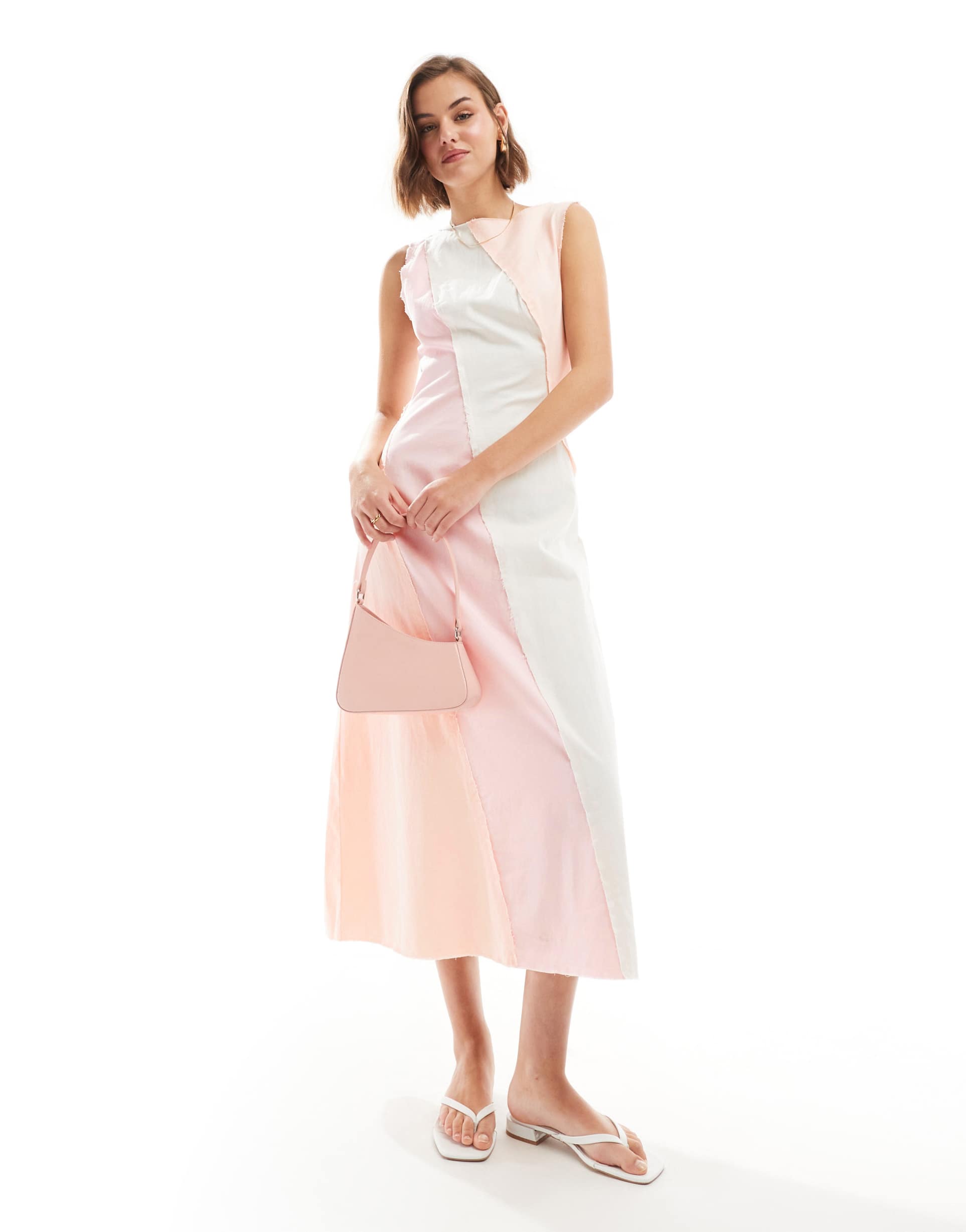 ASOS DESIGN A-LINE CONTRAST PANEL DENIM-LOOK MIDI DRESS WITH RAW HEM IN DENIM PINK