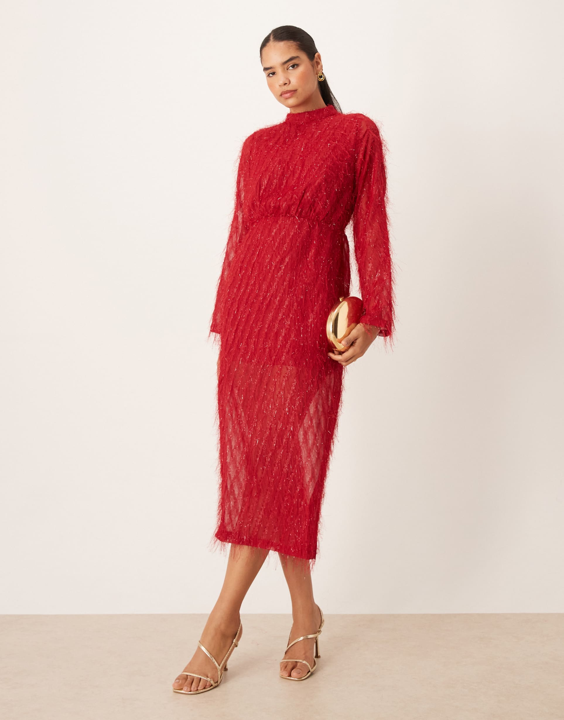 A vibrant red maxi dress featuring a fluffy textured finish and a sophisticated high neckline. The long sleeves and regular fit offer comfortable elegance, while the button-keyhole back adds a subtle yet stylish detail. A kick slit hemline enhances movement and allure, making this dress an ideal choice for cocktail events, date nights, or evening outings. Crafted from smooth polyester, it pairs classic charm with modern texture for an effortlessly chic look this autumn and winter.