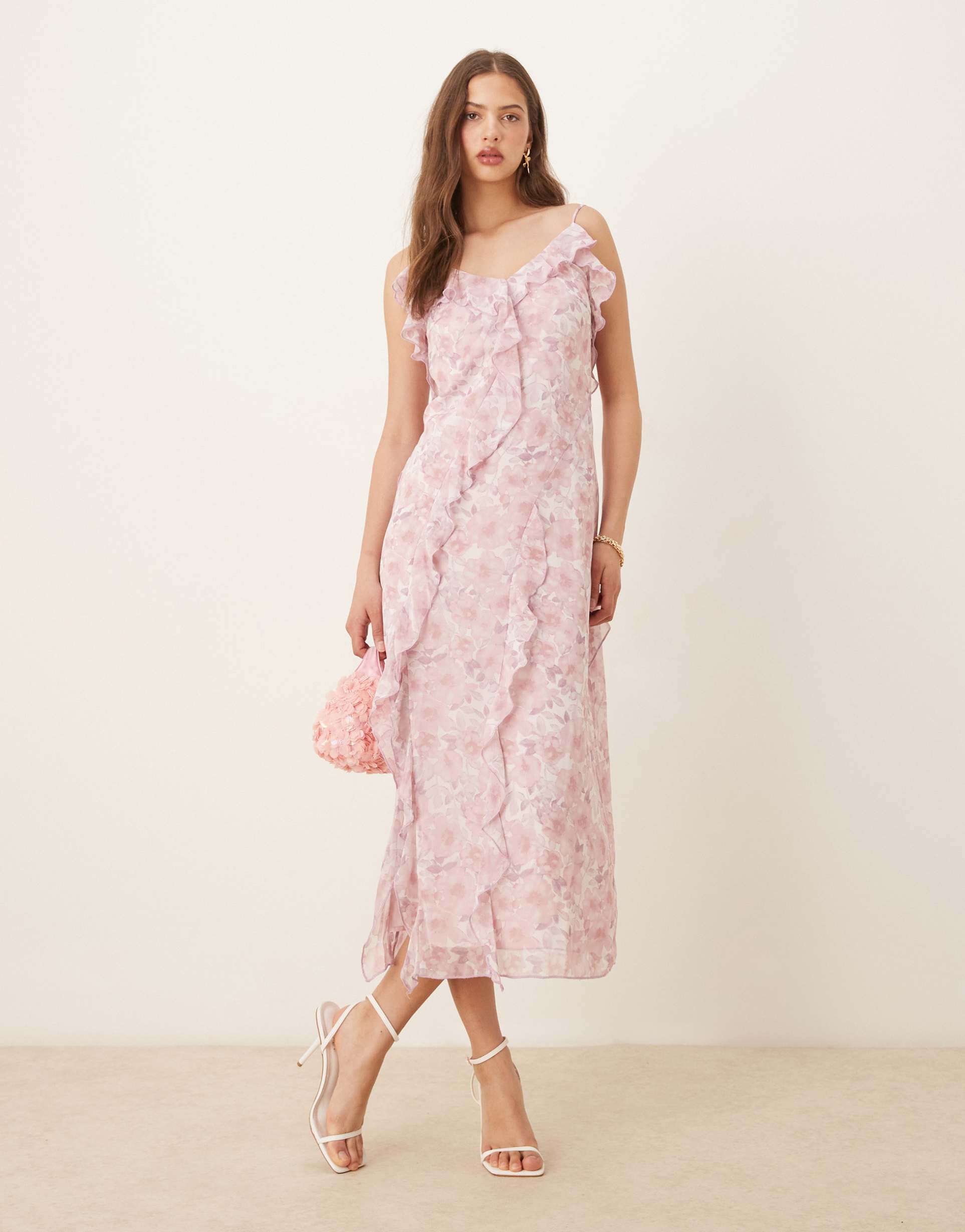 VILA FRILL TRIM MIDI DRESS IN PINK DELICATE FLORAL