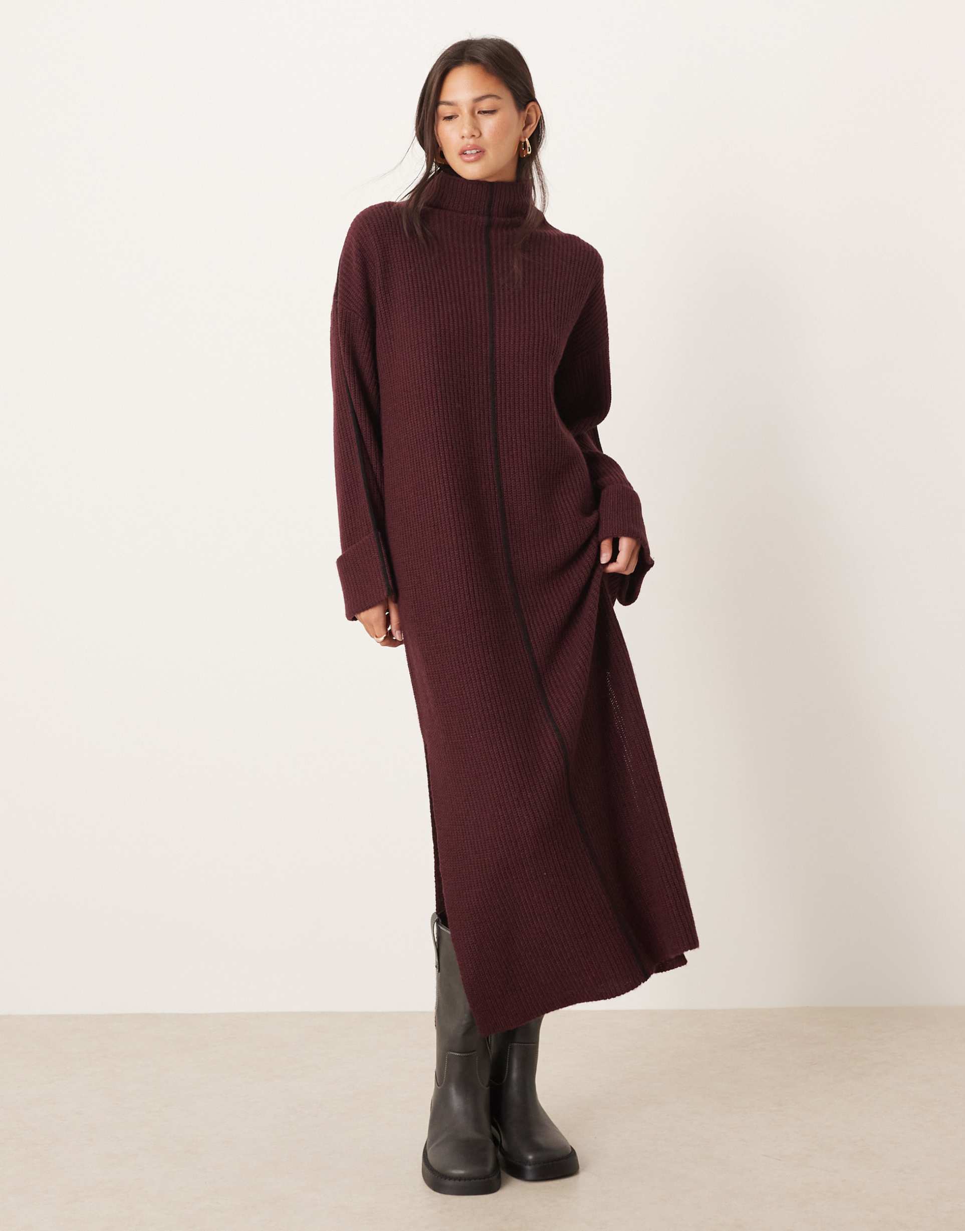 Rich burgundy knit fabric and a sleek high neckline define this maxi sweater dress with drop shoulder sleeves and seam detailing. The regular fit and side slits provide ease of movement and comfort, while the ribbed texture adds subtle interest. Ideal for autumn and winter, this versatile piece suits casual outings, workwear, and relaxed brunches with friends, combining warmth with a minimalist silhouette.