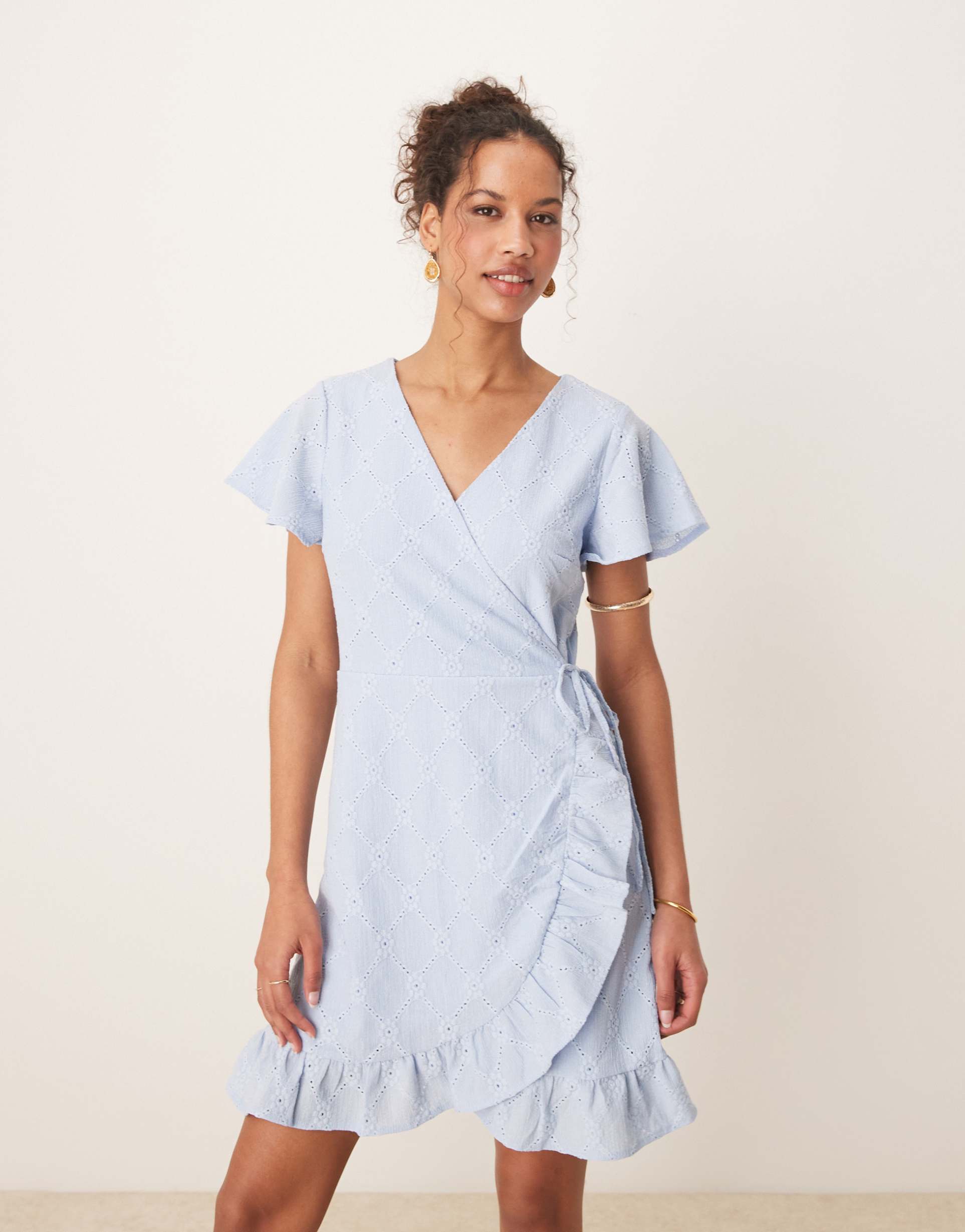 Soft and breezy, this kentucky blue wrap dress features delicate broderie anglaise embroidery and a flattering V-neckline. The regular fit and half sleeves create an easy-going silhouette, while the tie waist and ruffled hem add romantic charm. Crafted from lightweight polyester and elastane, it moves comfortably for spring and summer days. Ideal for casual outings, brunches, or date nights, this mini-length dress blends casual chic style with feminine details for versatile wear.