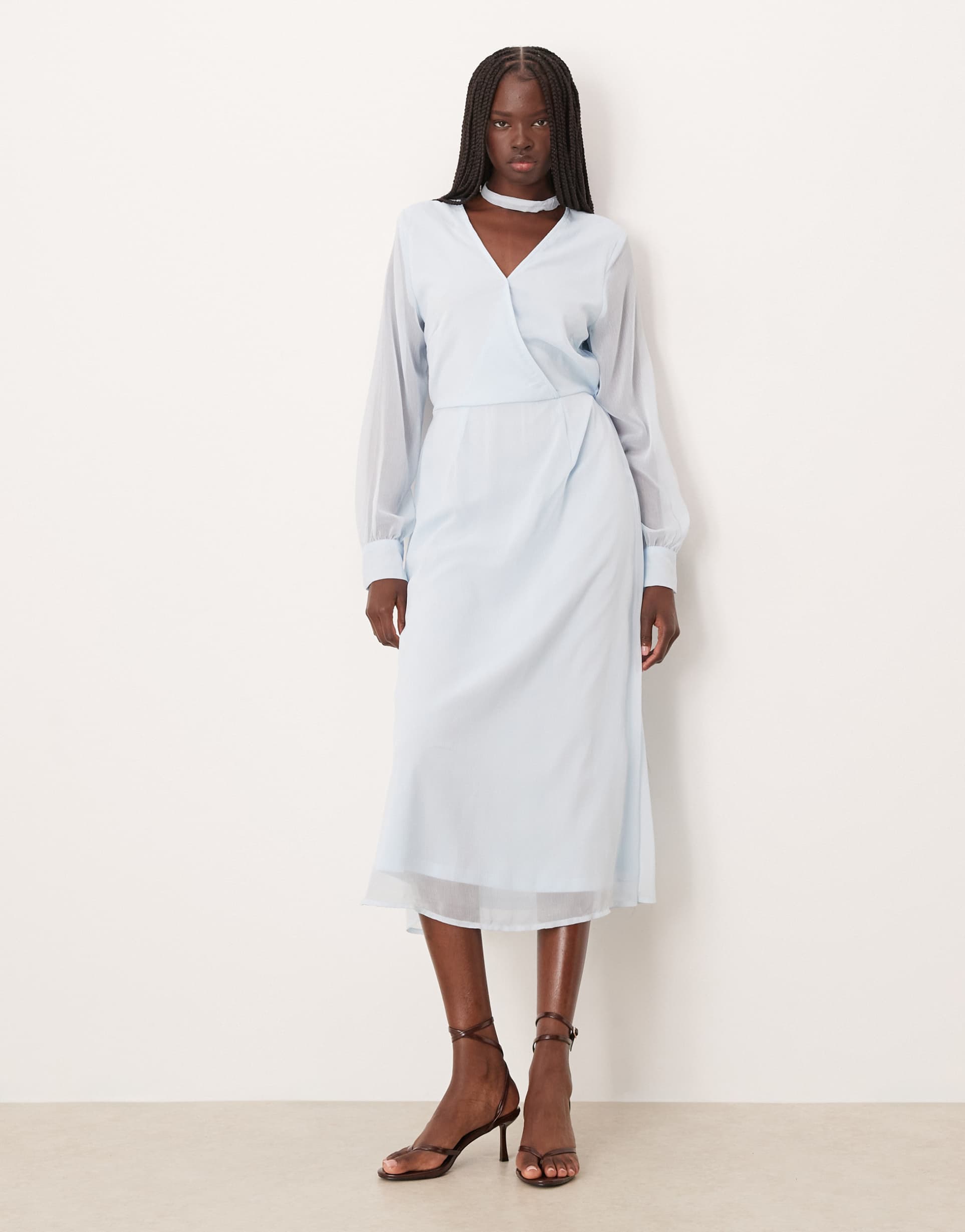 Soft chiffon fabric with a light blue hue defines this wrap dress, featuring a flattering V-neck and long sleeves for a balanced silhouette. The midi length and regular fit create an effortlessly elegant look, perfect for spring and summer occasions. A tie-up closure adds subtle detail and adjustability, while the clean hemline and sheer sleeve panels offer a delicate touch. Ideal for casual outings, brunches, date nights, or even workwear, this dress blends timeless style with modern ease.