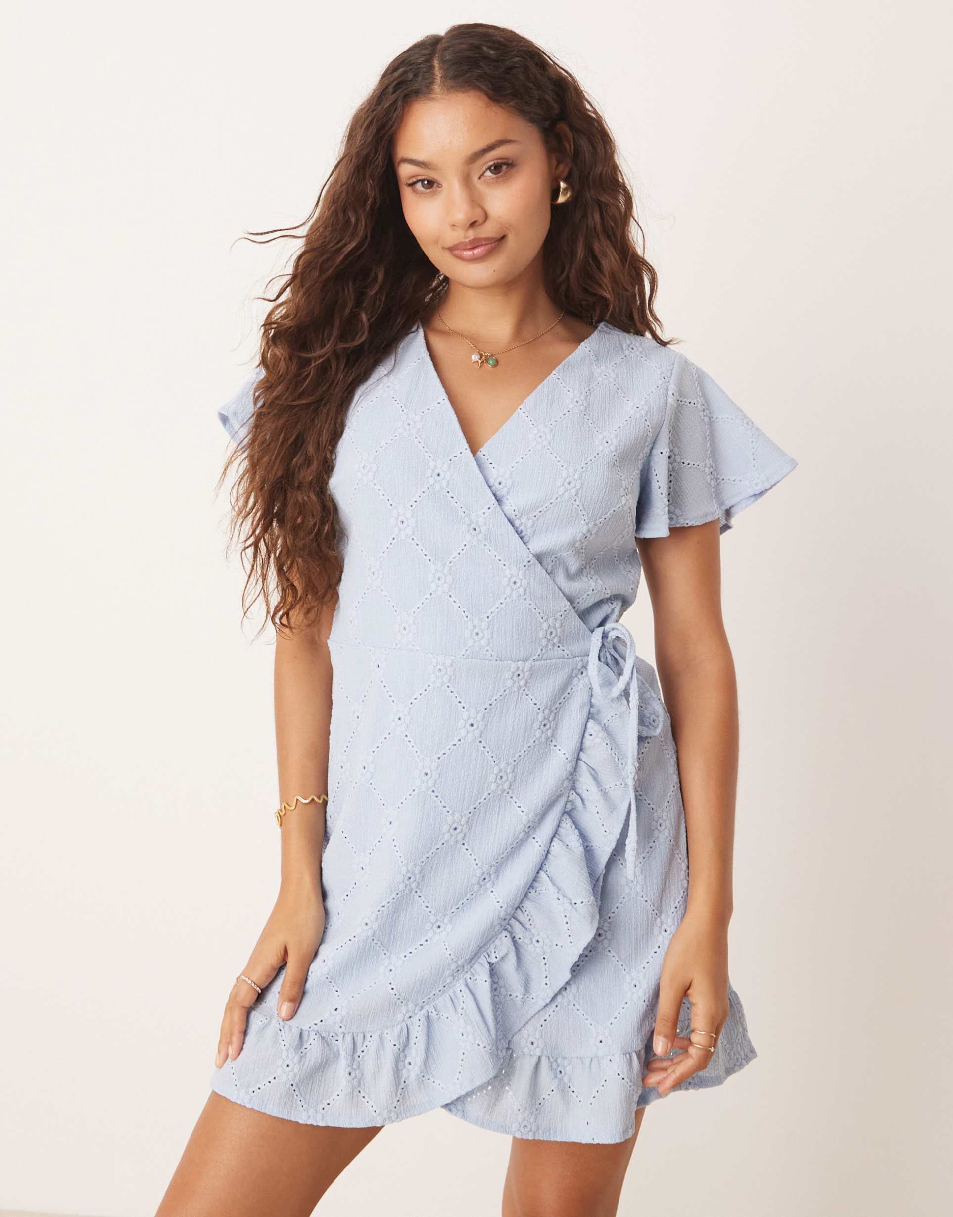 Soft jersey fabric with delicate broderie embroidery and a flattering wrap silhouette create a charming mini dress in a refreshing matte light blue. The V-neckline and half sleeves enhance its classic appeal, while the tie waist and ruffled hem add feminine detail. Designed for petite frames, this regular fit dress is ideal for casual outings, brunch dates, or relaxed spring and summer days. Comfortable yet stylish, it offers versatility for day-to-night wear with an easy-to-style, timeless aesthetic.