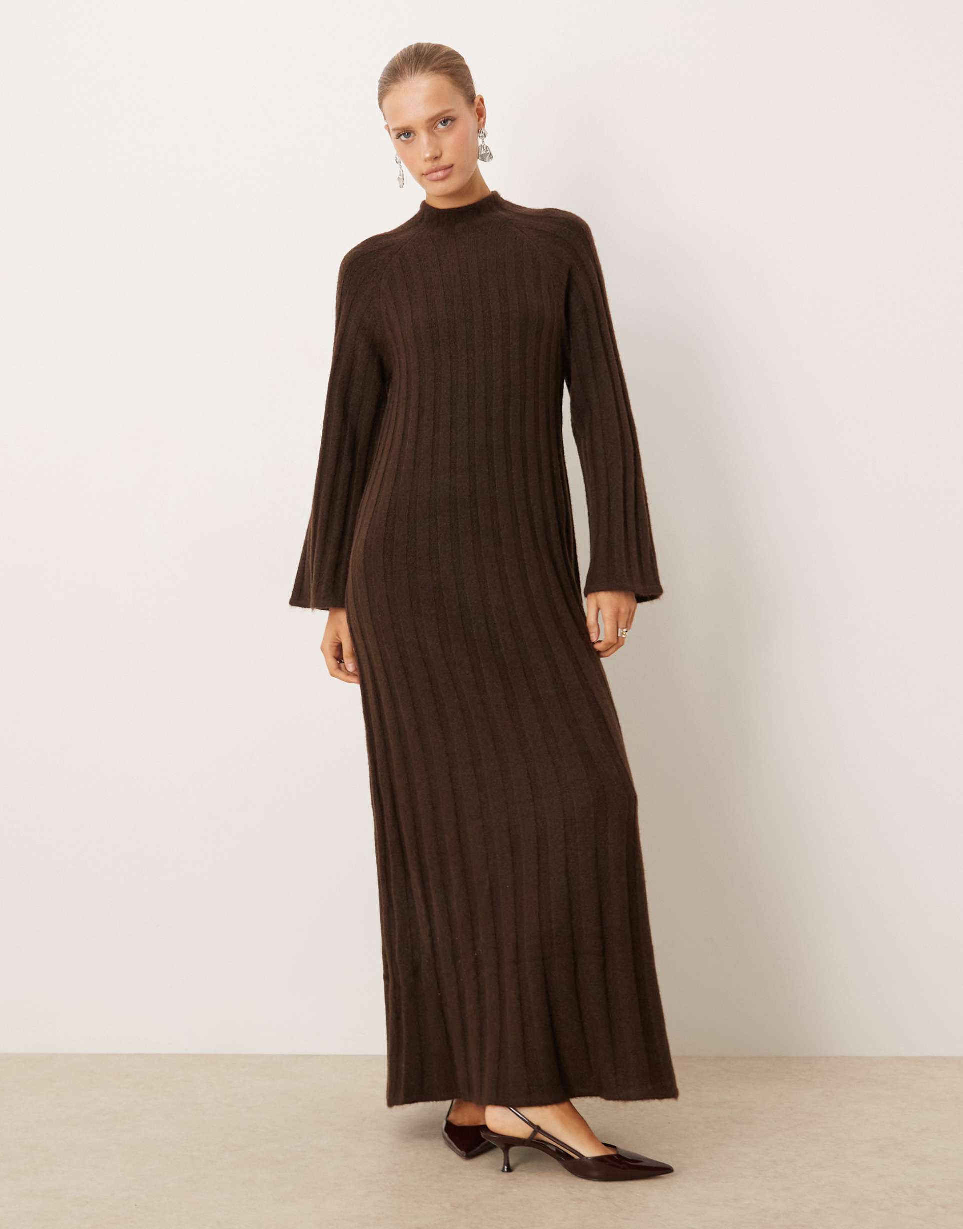 Embody cozy sophistication with this ribbed knit maxi sweater dress in a rich matte brown hue. Featuring a high neck and long regular sleeves, it offers a regular fit that flatters while providing warmth for autumn and winter seasons. The clean hemline and minimalistic design make it versatile for casual days, workwear, or business casual settings. Crafted from a soft blend of polyester and wool, this dress combines comfort with classic style, perfect for effortless layering and timeless appeal.