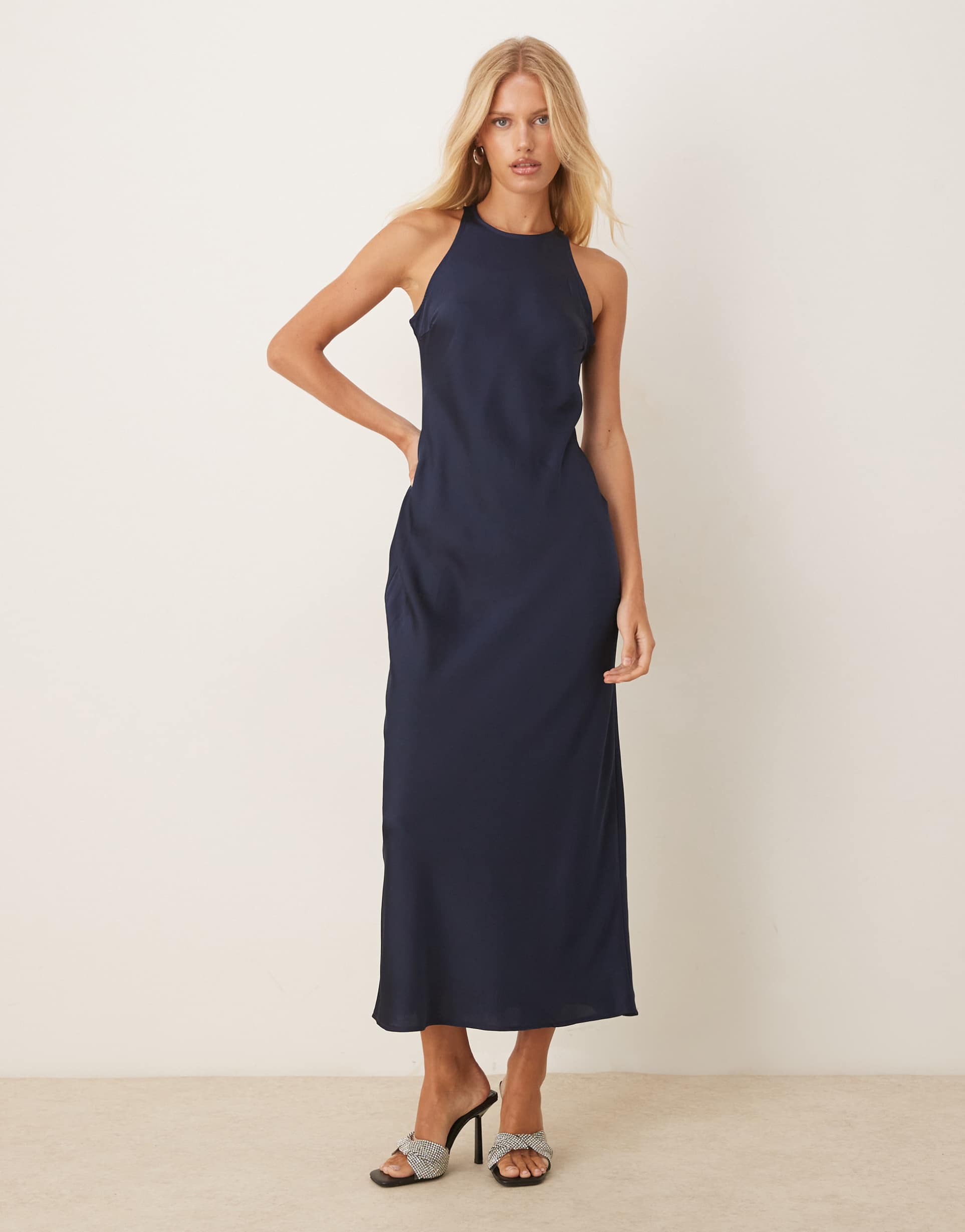 Glossy satin fabric and a sleek sheath silhouette come together in this deep navy midi dress with a flattering slim fit. The round neckline and sleeveless styling create an elegant yet modern profile, while the keyhole button back adds a subtle design detail. Its drapey, silky-smooth texture makes it ideal for cocktail parties, date nights, or evening events. A versatile piece that combines minimalist sophistication with luxurious fabric, perfect for elevating your wardrobe with timeless charm.