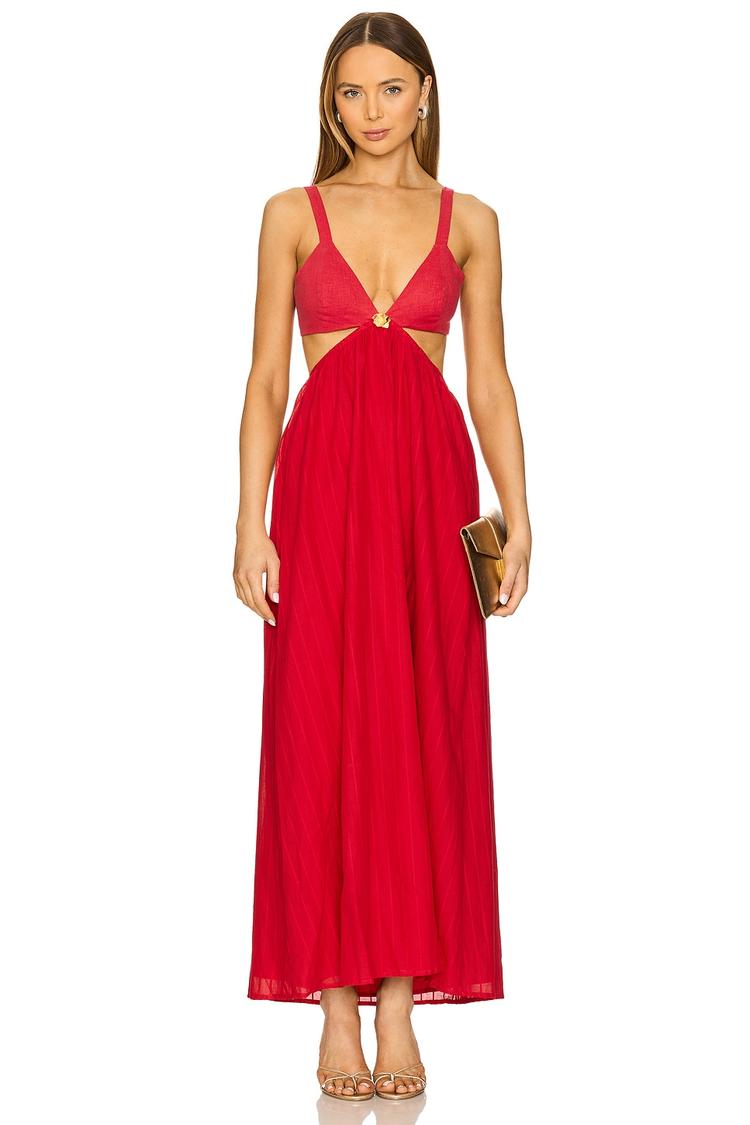 Vibrant red hues and a flowing maxi silhouette define this elegant bohemian dress, perfect for warm weather. Featuring a plunging V-neck and wide straps, the sleeveless design offers a breezy, comfortable fit. The open back with a gold-tone clasp adds a touch of sophistication, while padded cups provide support and shape. Crafted from a blend of linen, viscose, and cotton, it ensures breathable comfort and effortless style. Ideal for beach vacations, brunch dates, or relaxed evenings, this fully lined maxi dress combines casual charm with refined details.
