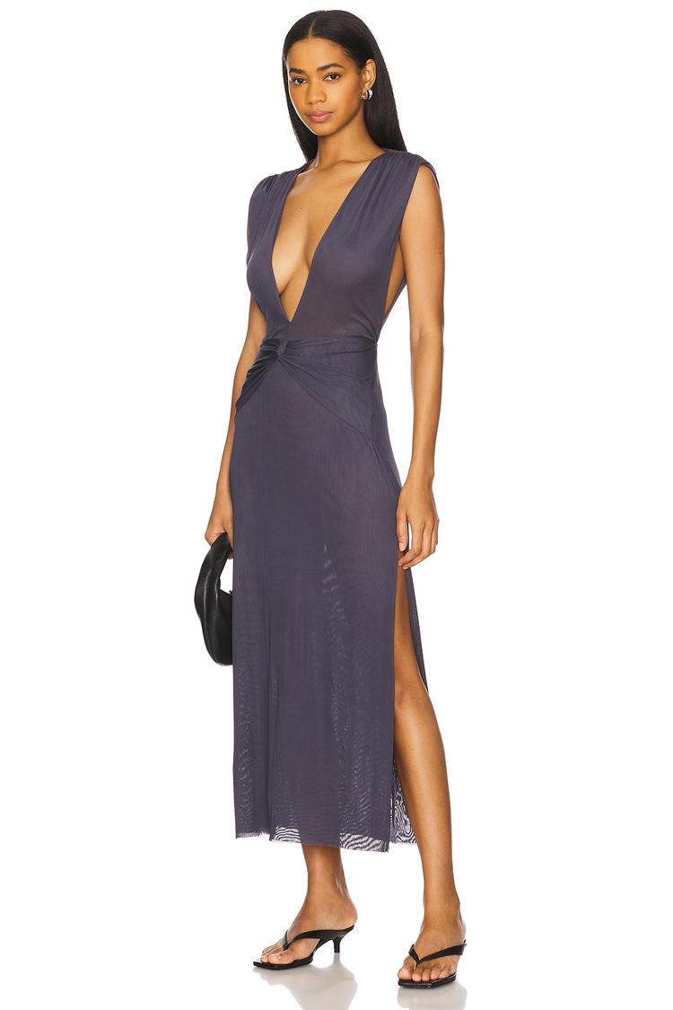 Soft matte dark blue mesh fabric forms a sleek midi cover-up perfect for summer beach days or poolside lounging. The plunging front V-neckline and sleeveless wide straps create an elegant yet casual silhouette, complemented by a subtle side slit that adds movement and ease. Crafted from polyester and elastane, this slim-fit piece offers stretch and comfort with pull-on styling for effortless wear. Fully lined for coverage, it's an ideal choice for vacation or pool occasions where style meets relaxed sophistication.