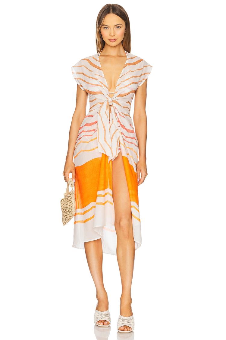 Lightweight cotton and linen blend fabric with a semi-sheer finish brings breezy comfort to this loose-fitting cover-up dress. Featuring a flattering V-neck and sleeveless wide straps, the front tie closure shapes the waist while the asymmetric midi hem adds a casual chic flair. The soft striped pattern in matte white, orange, and rose hues evokes a laid-back beach vibe, perfect for vacation days, casual outings, or beachwear essentials. Its effortless silhouette and breathable fabric make it ideal for warm spring and summer seasons.