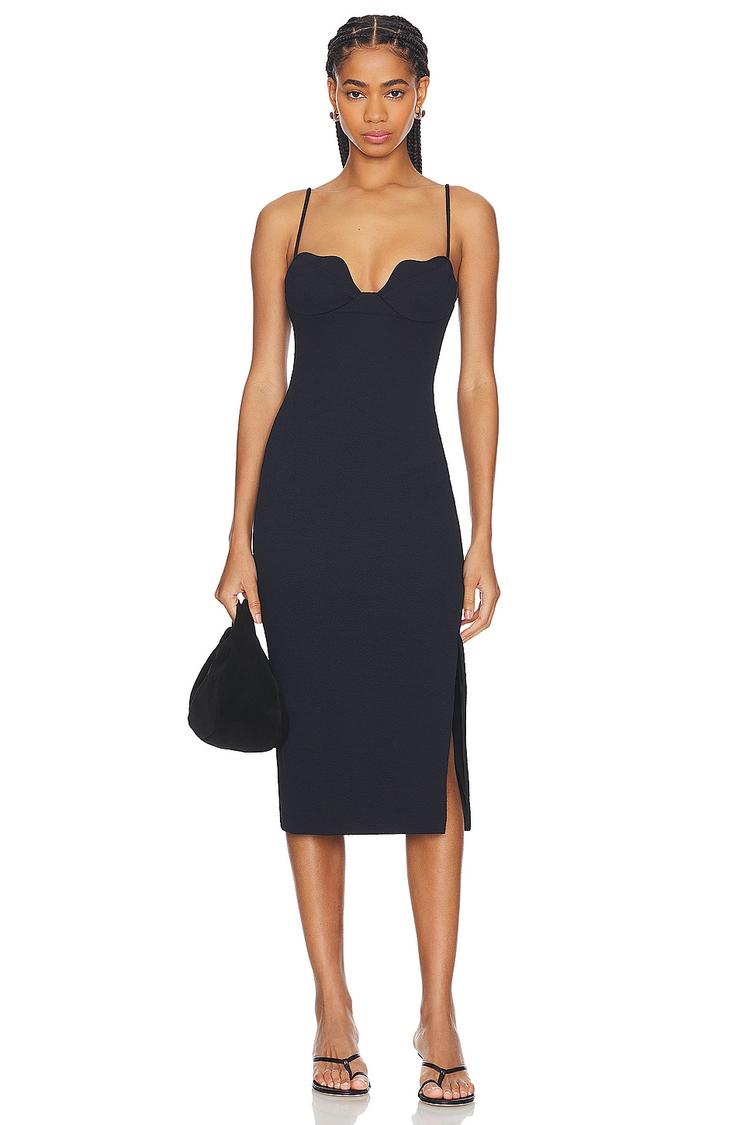 A sleek silhouette with a fitted sheath shape and a midi hemline creates a timeless look, enhanced by the sweetheart neckline and slender spaghetti straps. Crafted from a stretch polyester-elastane blend with a polyamide lining, the dress offers comfort and shape retention. The side slit adds a subtle hint of allure, perfect for summer nights, cocktail parties, or date nights. The pull-on styling with adjustable straps ensures a personalized fit, making this black midi dress a sophisticated choice for elegant evening outings and refined events.