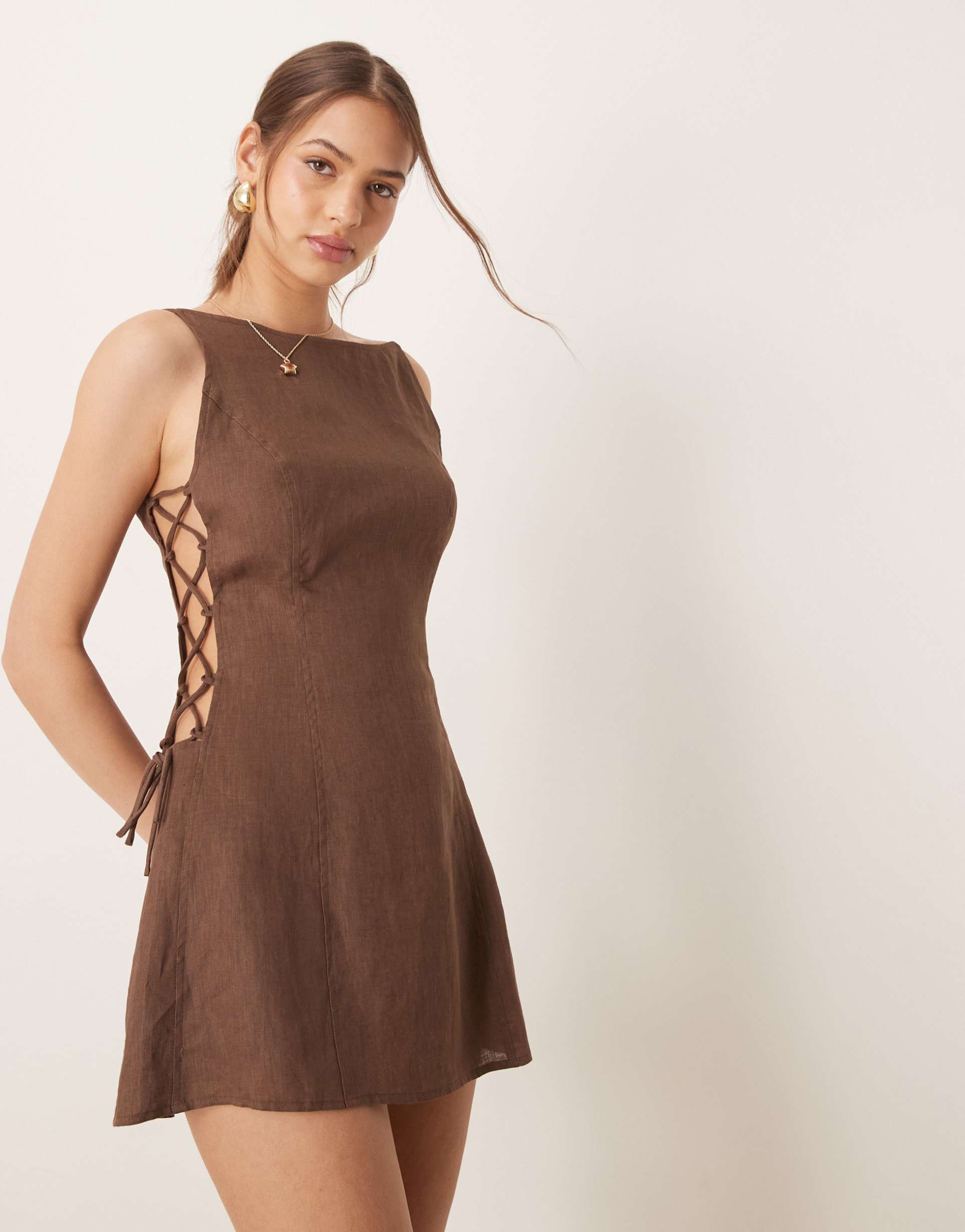 Lightweight linen fabric and a high neck silhouette define this modern mini dress, featuring sleeveless styling and lace-up sides for a subtle yet striking detail. The A-Line shape offers a regular fit that skims the body comfortably, finished with a clean hemline and back zip closure. Perfect for warm spring and summer days, it transitions effortlessly from casual brunches to intimate date nights with its minimalist charm and rich matte brown hue.