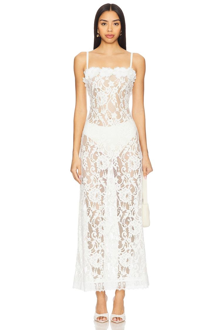 Delicate guipure lace overlays a slim-fitting maxi slip dress with a straight neckline and slender spaghetti straps. Crafted from breathable cotton with polyester contrast, this sheer white dress features an elegant covered back and a clean hemline, creating a romantic and minimalist silhouette perfect for spring and summer occasions. Ideal for brunches, cocktail parties, or date nights, its subtle lace trim and back zipper closure add refined detail to this timeless piece.