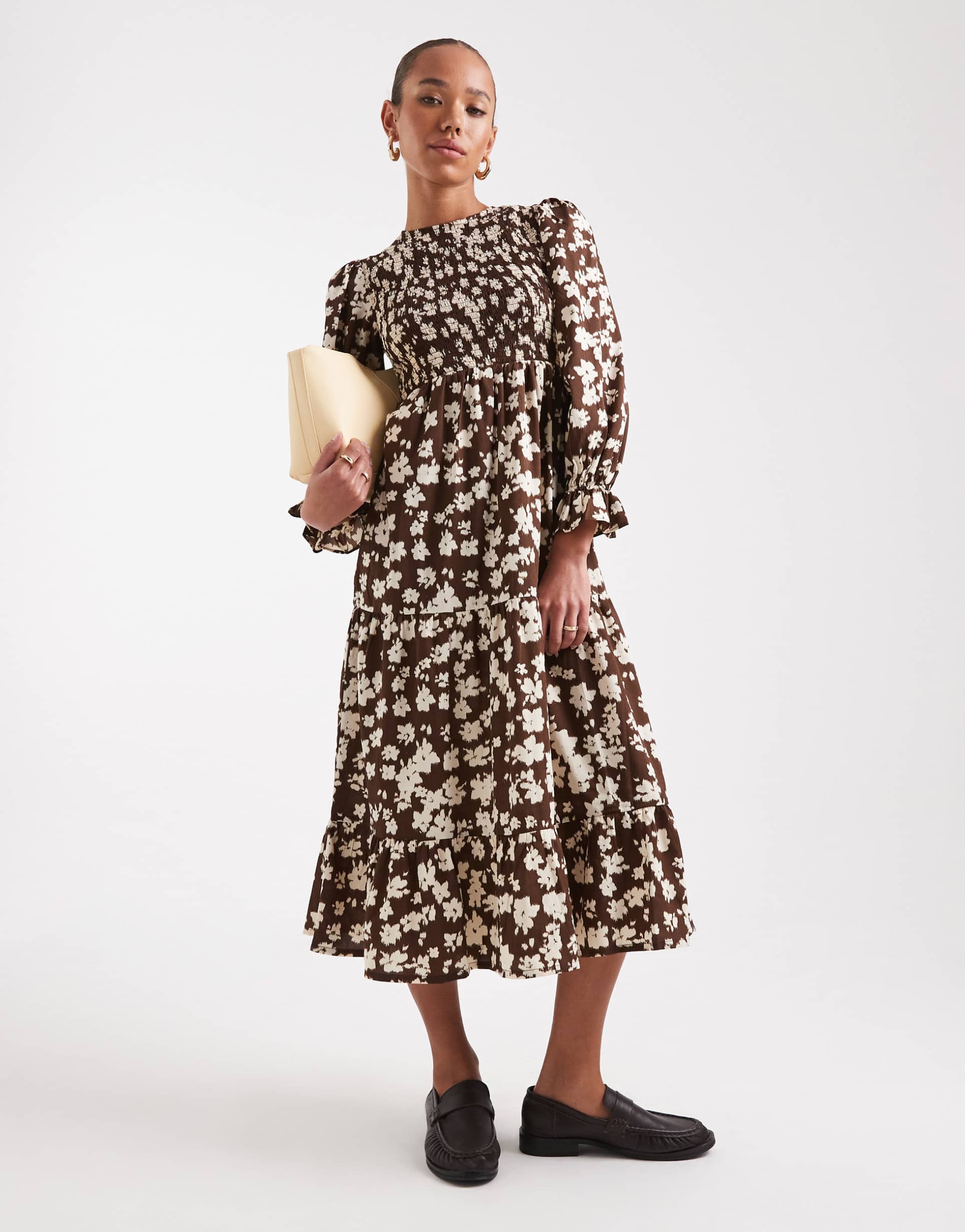 Soft chiffon fabric and a ditsy floral print combine with a shirred smock bodice to create a romantic midi dress in matte brown. The crew neck and long balloon sleeves add volume and vintage charm, while the regular fit and tiered hem offer comfortable wear. A button keyhole back closure adds subtle detail to the back. Ideal for casual outings, brunches, or date nights in spring and autumn, this bohemian-inspired midi dress brings effortless style and feminine appeal with its delicate floral pattern and soft, drapey texture.