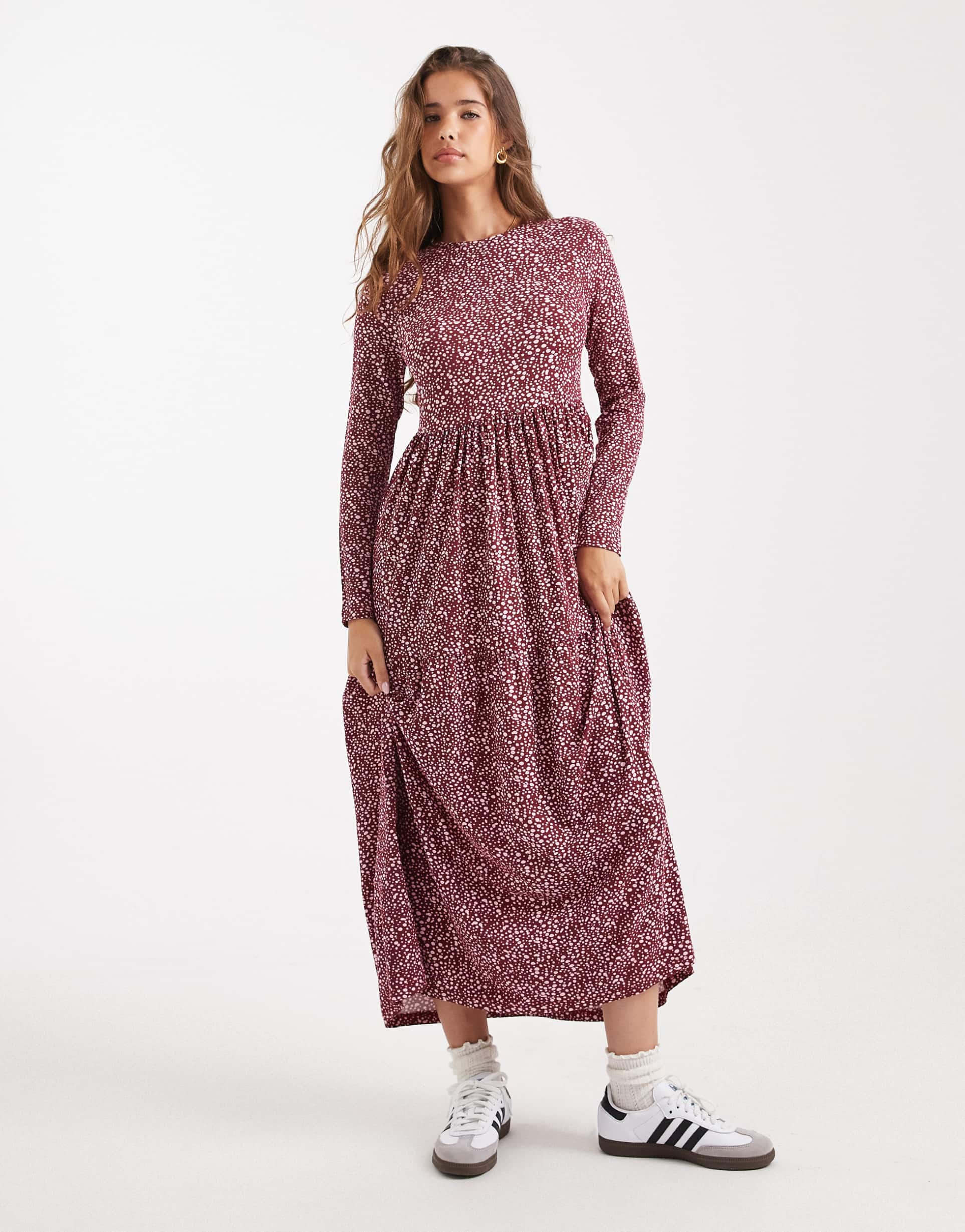Soft and stretchy jersey fabric forms a comfortable smock silhouette in a matte burgundy hue accented with delicate white polka dots all over. Featuring a round neck and long sleeves, this midi-length dress offers a regular fit with a button keyhole back for subtle detail. Its casual chic style is ideal for autumn, winter, and spring days, making it perfect for casual outings, brunch dates, or relaxed date nights. The clean hemline and breathable knit fabric enhance everyday wearability with effortless charm.