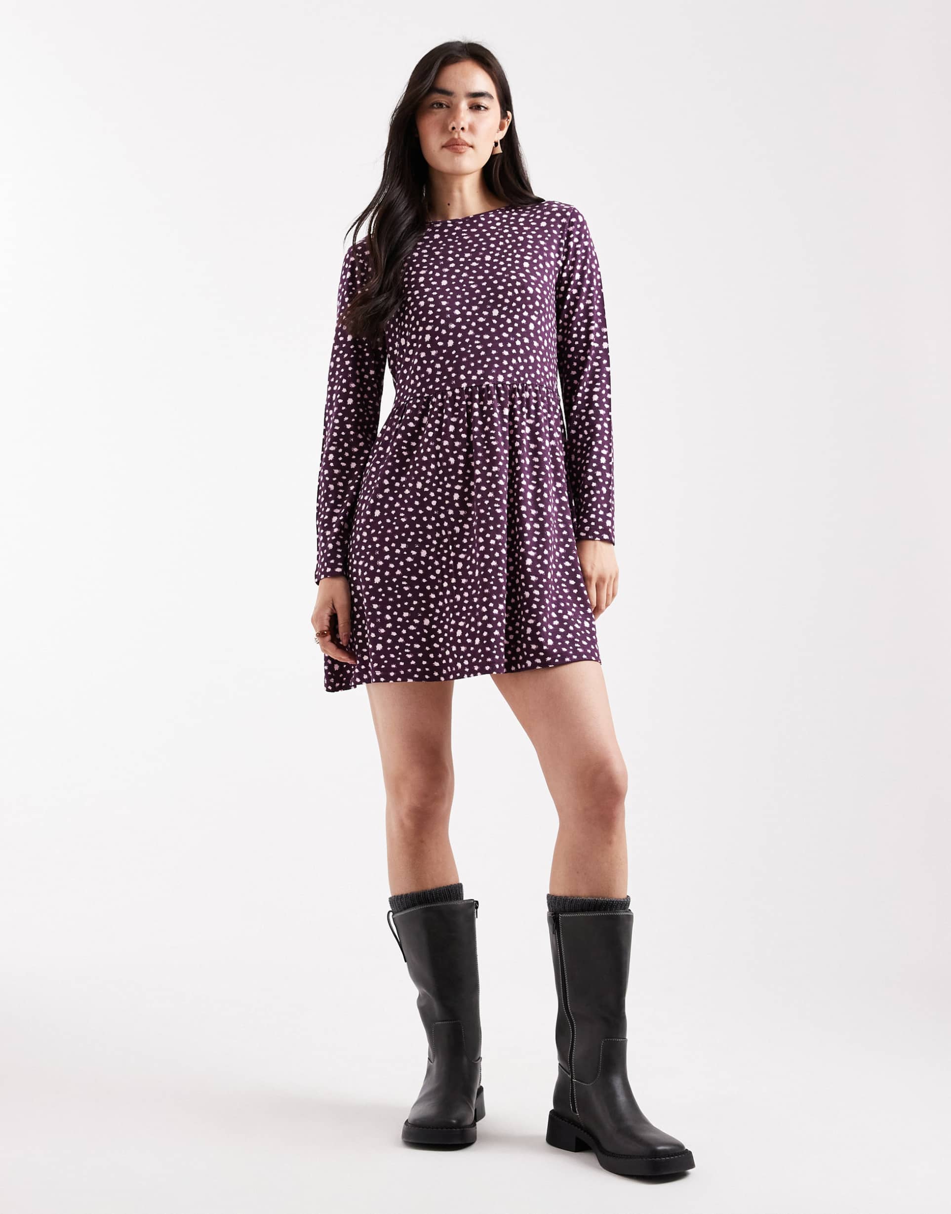Soft jersey fabric in a plum pink hue with an abstract smudge spot pattern creates a cozy yet stylish look. The mini length and regular fit of this shift silhouette, combined with a classic round neckline and long sleeves, make it versatile for casual outings, date nights, or everyday wear. The buttoned keyhole back adds a subtle design detail enhancing the overall appeal. Comfortable and stretchy viscose and elastane jersey fabric ensure ease of movement and all-day comfort during cooler seasons.