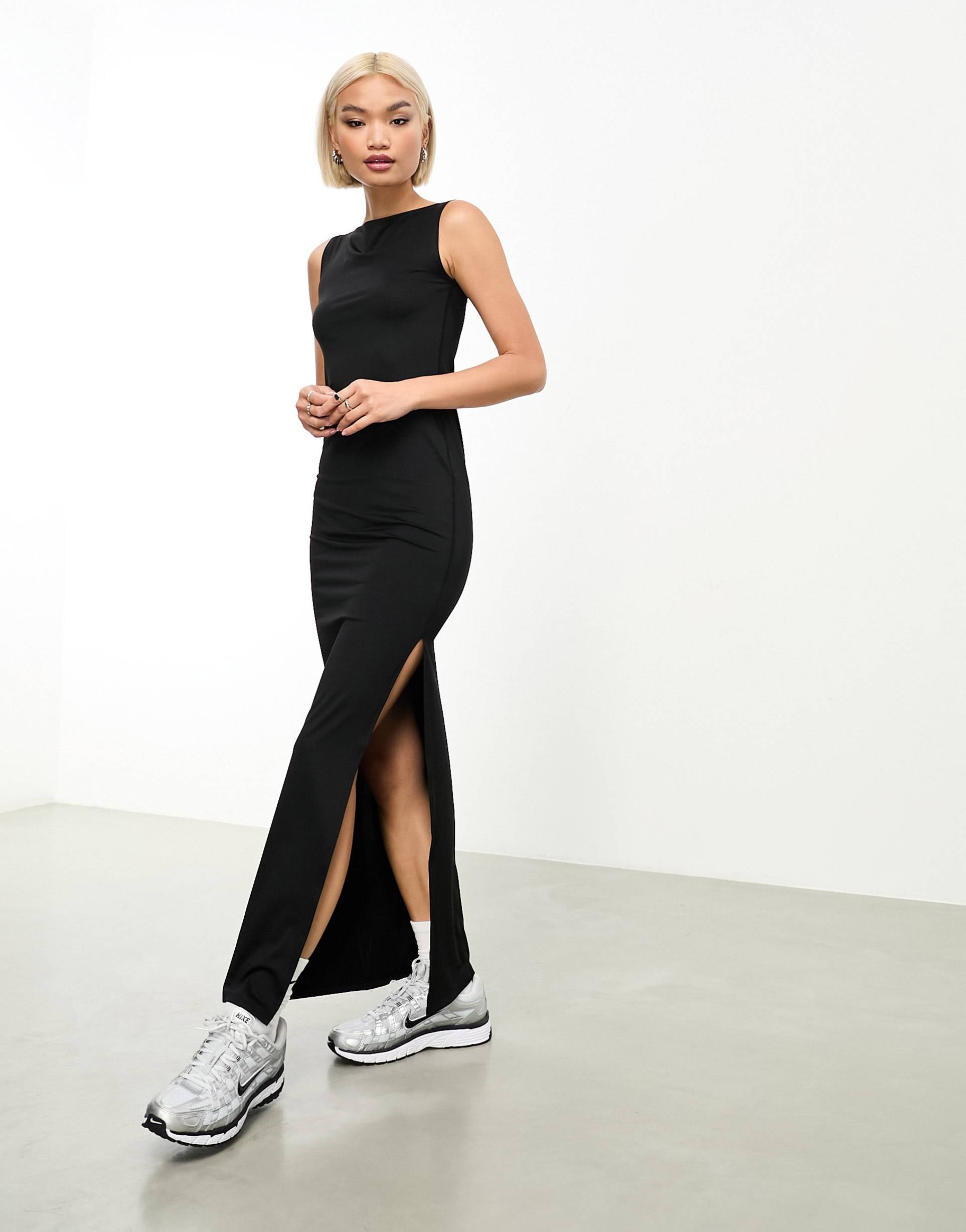 WEEKDAY ANNIE BOATNECK MAXI DRESS WITH SIDE SPLIT IN BLACK