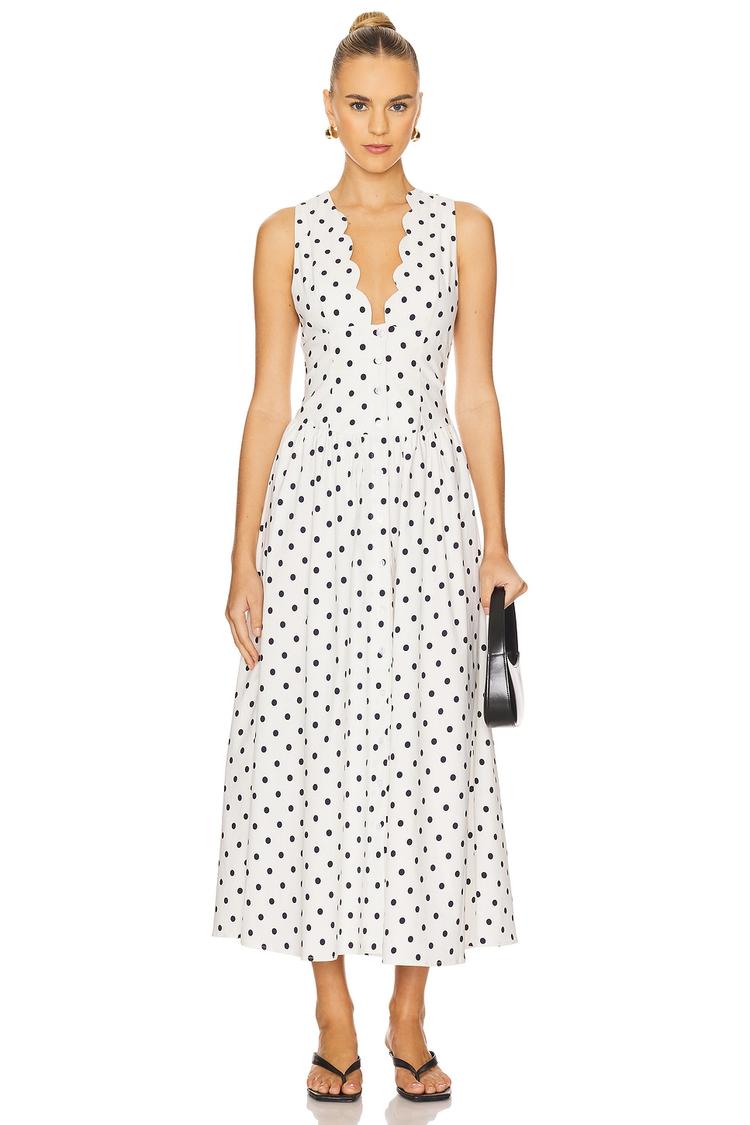 Soft midi-length poplin with a lightweight feel frames a classic A-line silhouette adorned with timeless black polka dots. The scalloped neckline adds a delicate ruffle detail, paired with wide straps and a neat button-front closure for effortless elegance. This versatile dress offers a regular fit, perfect for spring through autumn, ideal for brunch, casual outings, or workwear with a minimalist, classic style. Its breathable blend of rayon, nylon, linen, and spandex ensures comfort and movement throughout your day.