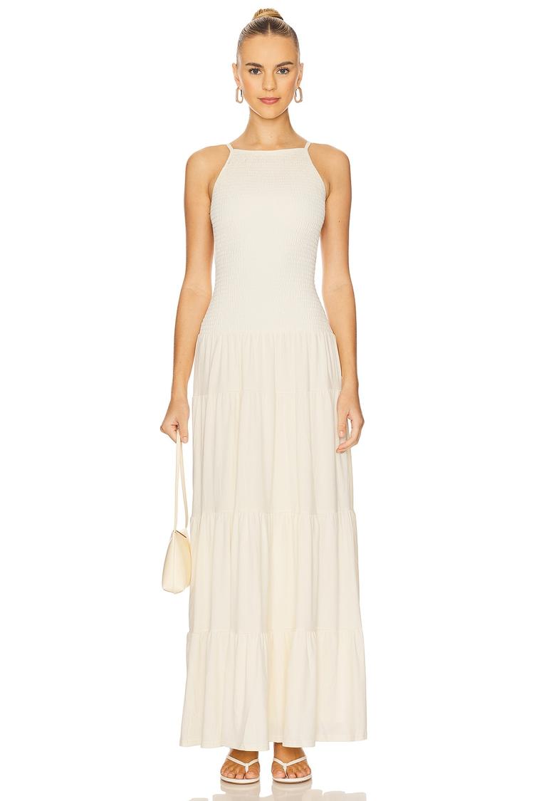 Soft and lightweight, this off-white maxi dress features a smocked drop waist bodice that flatters with a slim fit and adjustable back straps for a custom feel. Its sleeveless design with a square neckline and flowing tiered hem offers breezy comfort, perfect for spring and summer outings. Crafted from a polyester-spandex blend, it provides stretch and ease for casual chic vibes. Ideal for brunches, beach vacations, or relaxed date nights, this dress blends minimalist style with effortless elegance.