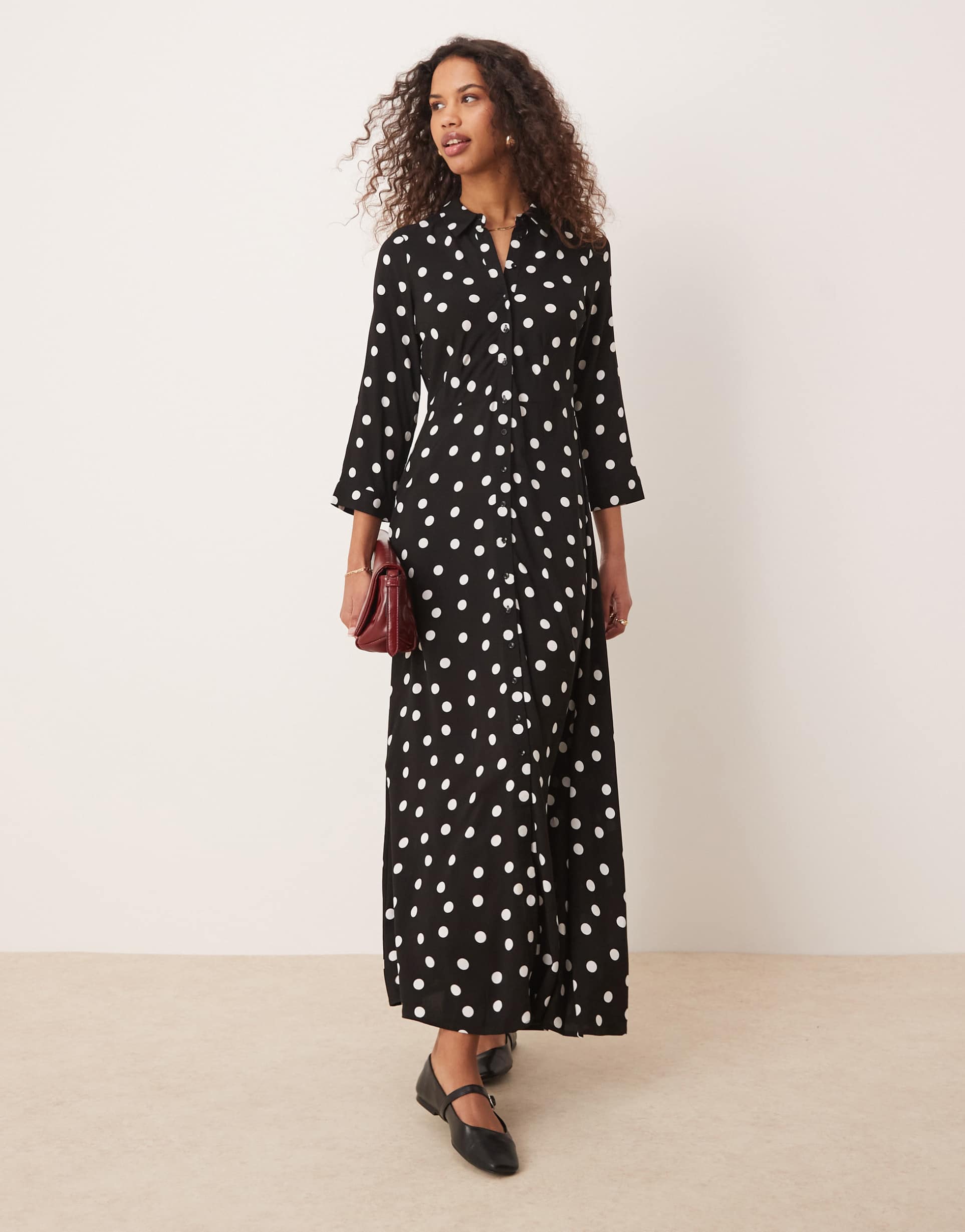 YAS MAXI SHIRT DRESS IN BLACK POLKA DOT PRINT