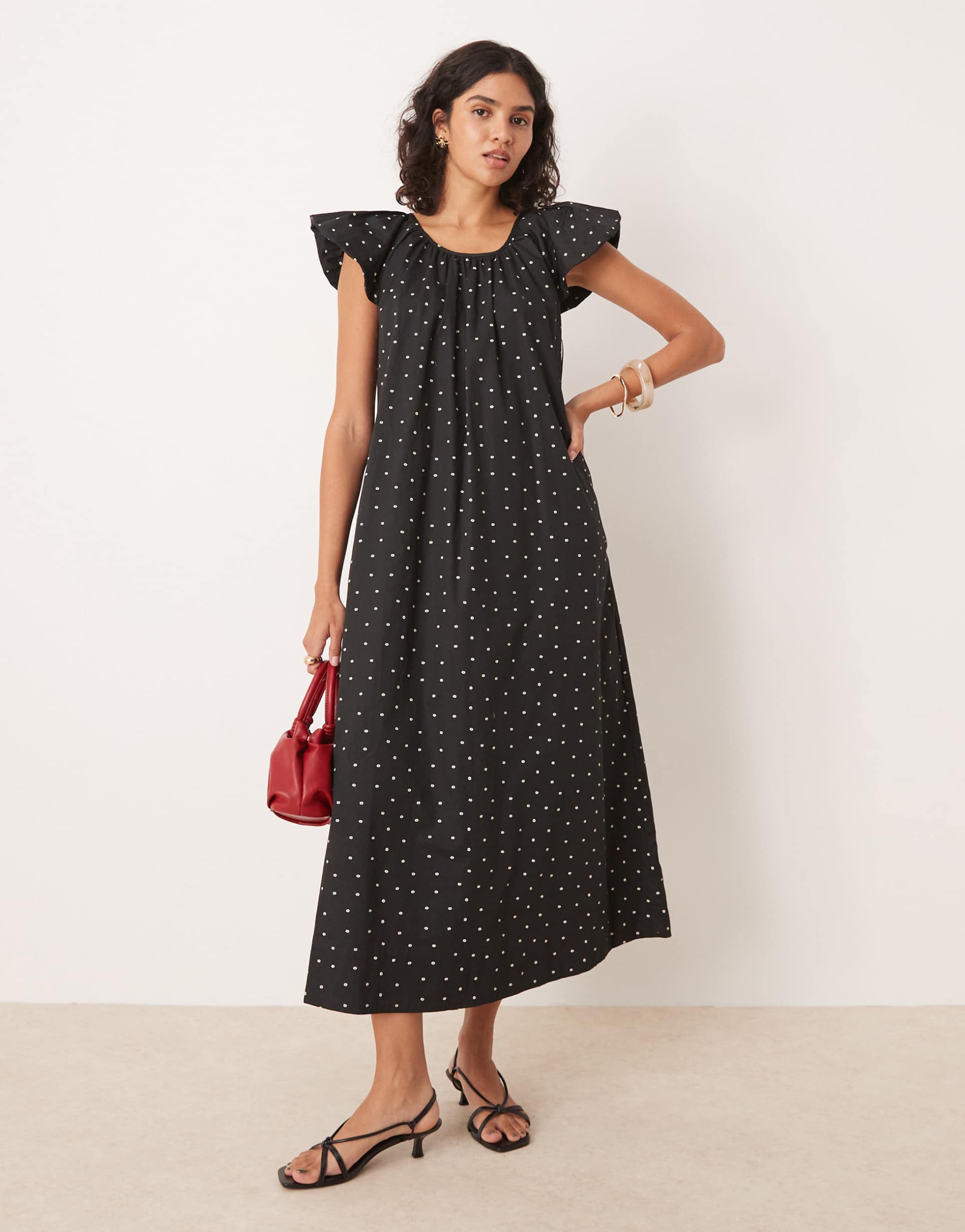 Soft cotton fabric and a relaxed shift silhouette create an effortless look in this black midi dress adorned with classic white polka dots. Featuring flutter sleeves and a round neckline, it offers breezy comfort and feminine charm. The cut-out back with a tie-back fastening adds a subtle, stylish detail perfect for casual brunches, everyday wear, or date nights. Its versatile design suits spring through autumn seasons with ease.