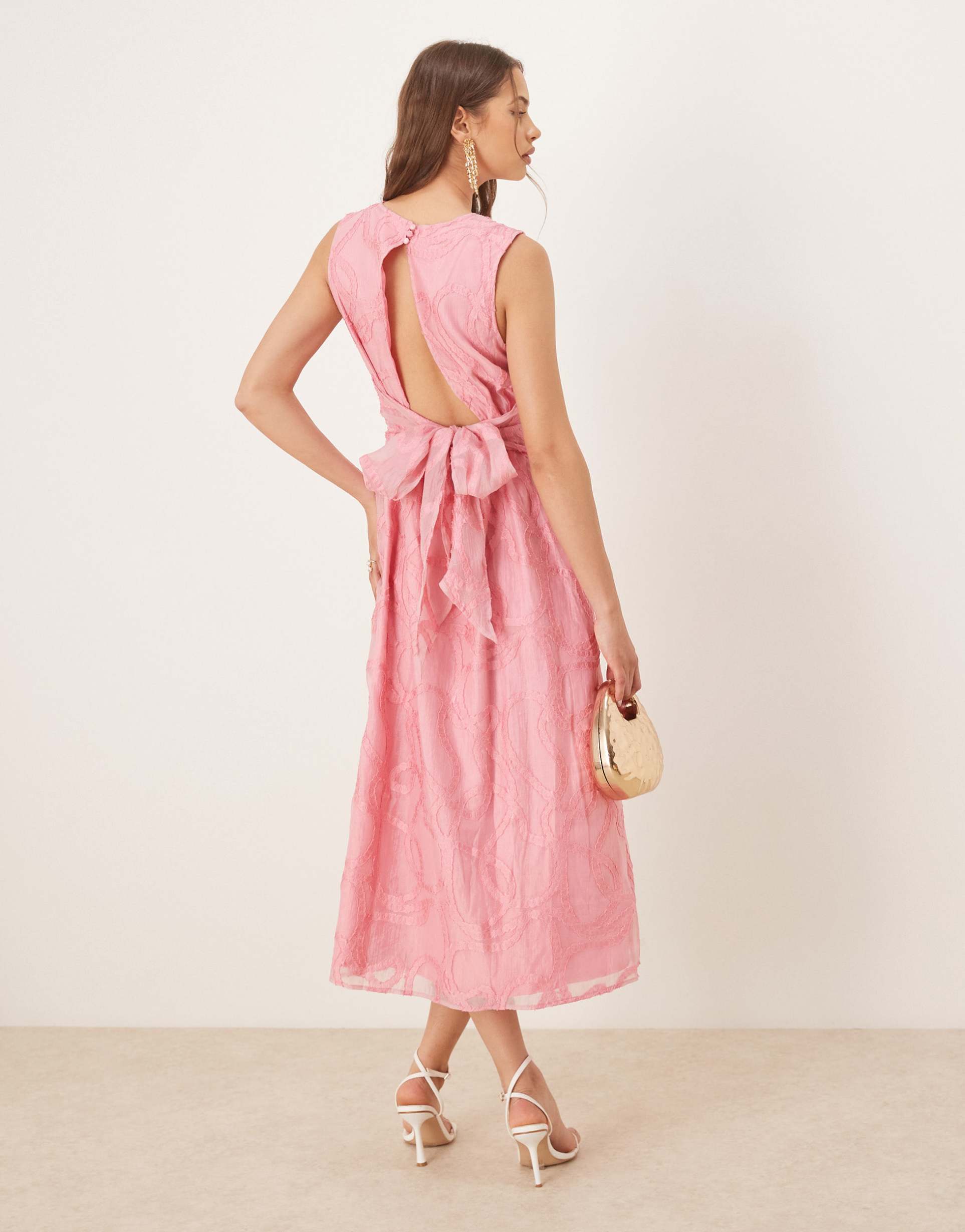 YAS ROPE EMBROIDERED BOW BACK DETAIL MIDI DRESS IN BUBBLEGUM PINK