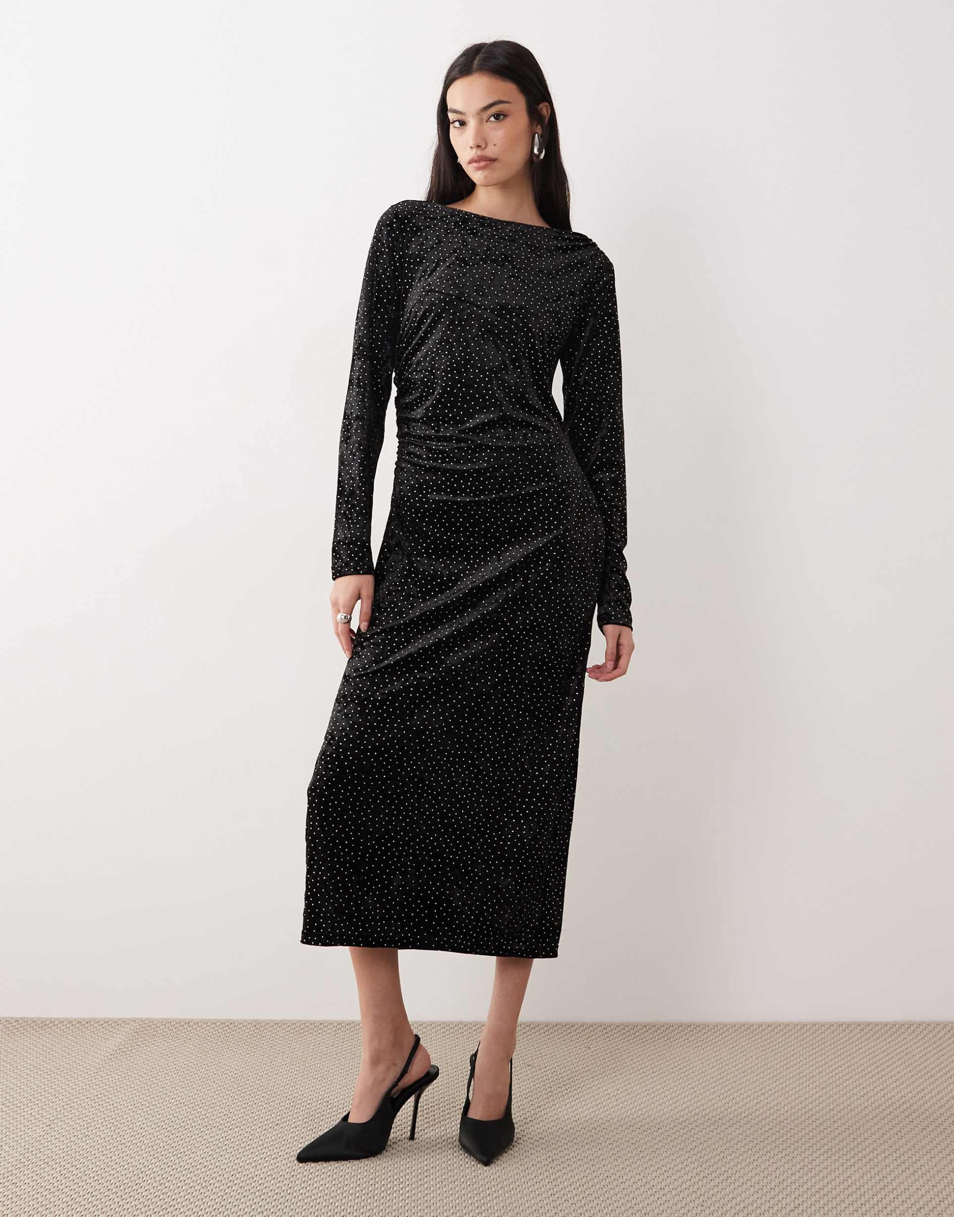 Soft matte black velvet forms a sleek sheath silhouette with a flattering regular fit and elegant midi length. The boat neck and long sleeves add timeless sophistication, while ruched detailing on the front and side bring texture and subtle contouring. A tasteful side slit introduces a hint of allure and ease of movement. This dress pairs perfectly with heels for cocktail parties, date nights, or evening events during autumn and winter, blending classic elegance with contemporary charm and plush fabric comfort.