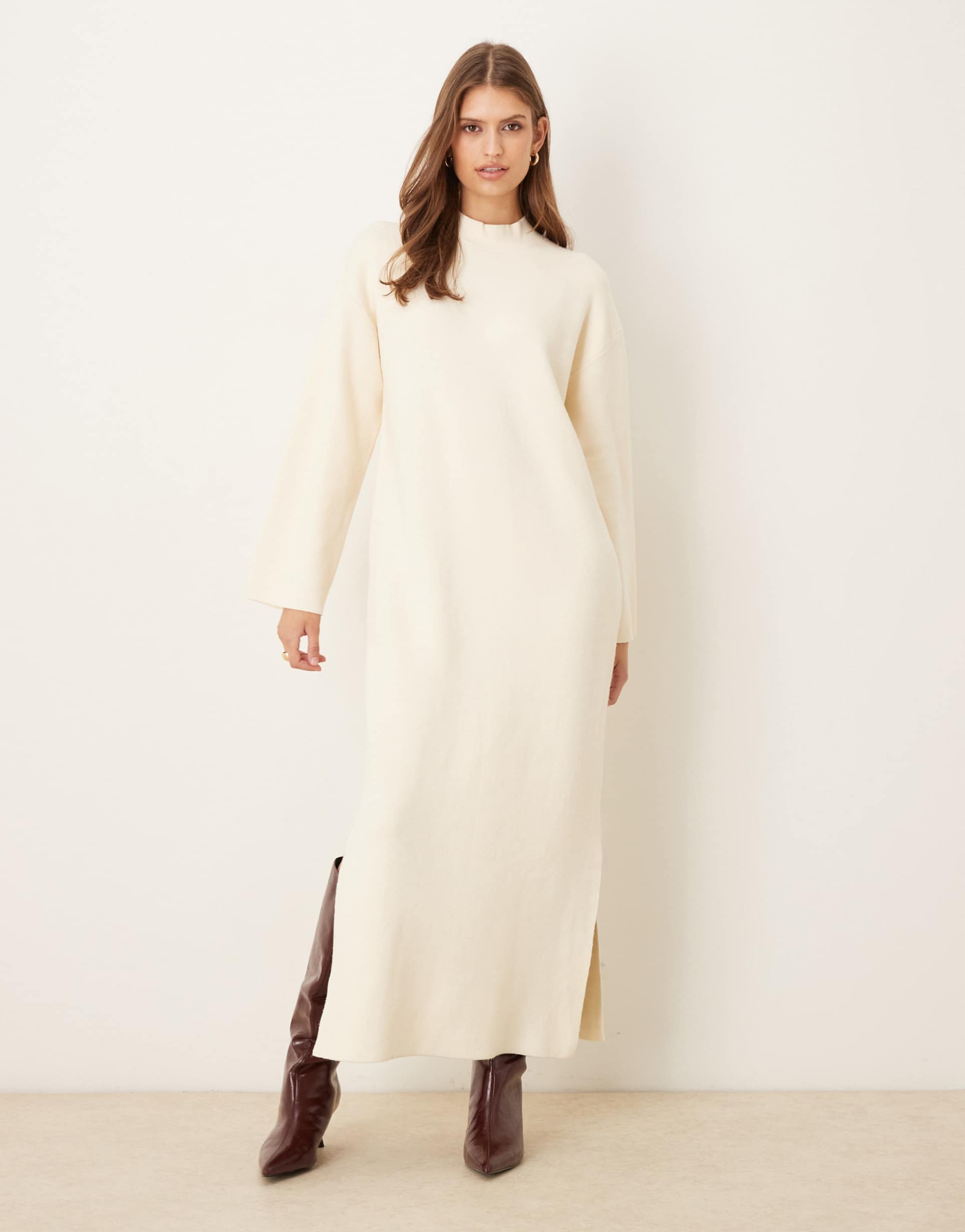 Soft cream knit fabric and a high neckline define this maxi sweater dress with long sleeves and side slits for ease of movement. Its regular fit and clean hemline create a minimalist silhouette perfect for autumn and winter days. Ideal for casual office wear, business casual settings, or relaxed weekend outings, this dress combines classic styling with comfortable knit texture for versatile seasonal wear.