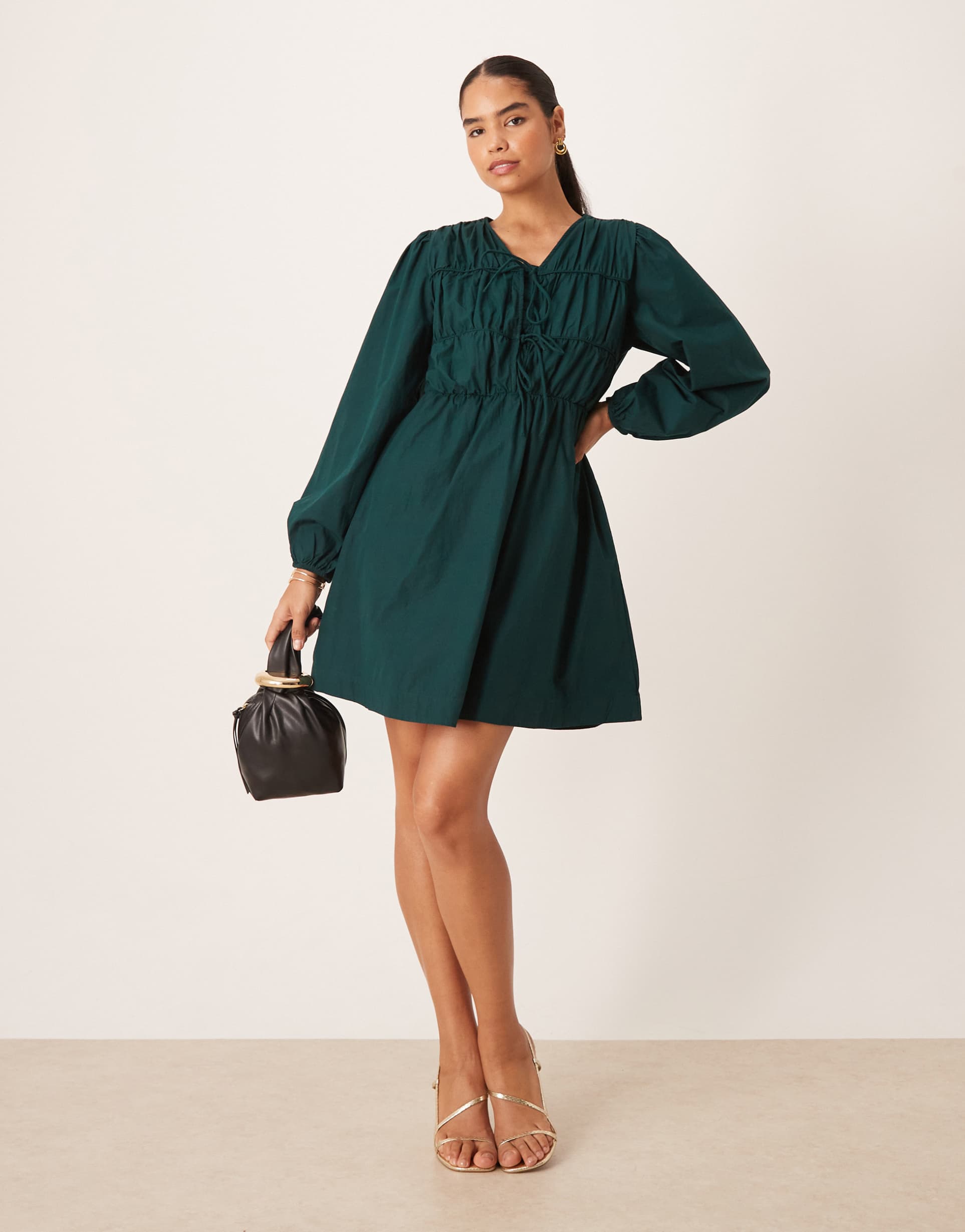 YAS TIE FRONT LONG SLEEVE MINI DRESS IN DEEP JEWEL GREEN