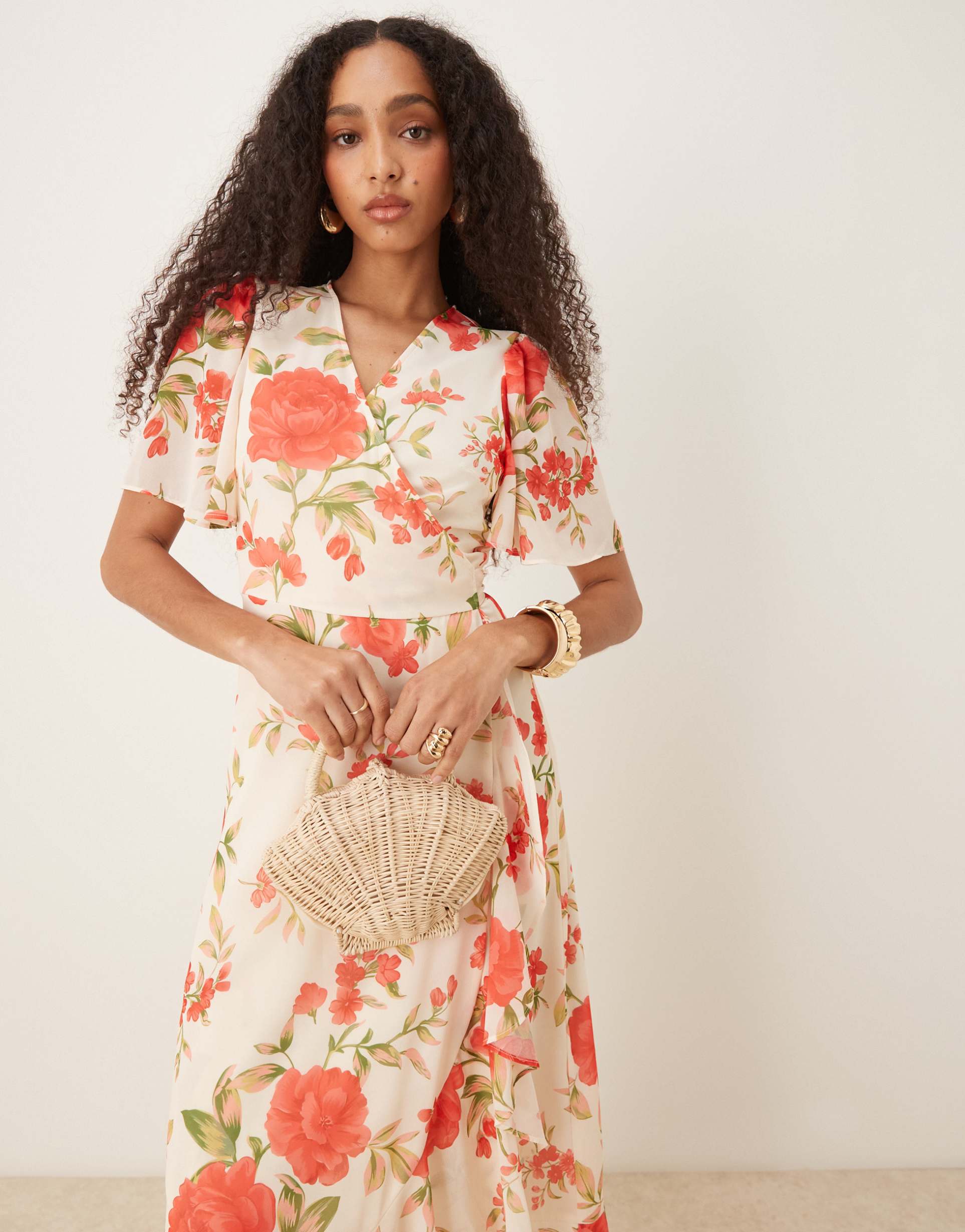 YAS WRAP FRONT FLUTED SLEEVE CHIFFON MAXI DRESS IN CREAM ROSE PRINT