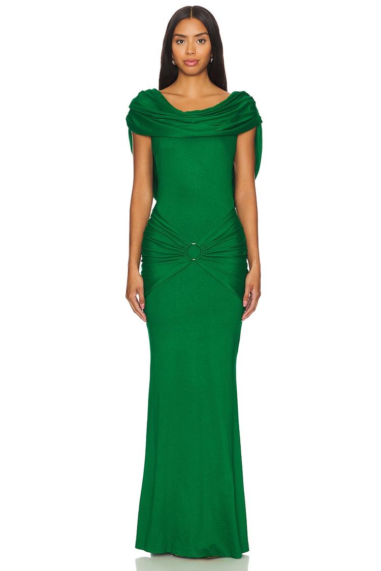 Rich matte green viscose jersey forms a sleek, fitted column silhouette with a graceful maxi length. The dress features elegant draped neckline fabric that cascades into a striking drape back, complemented by ruching details on the bodice and sides for a flattering fit. Sleeveless with wide straps, this pull-on style combines sophistication and comfort, making it ideal for formal events, cocktail parties, and romantic date nights. Crafted from stretch jersey, it promises ease of movement and a polished look that transitions seamlessly across seasons.