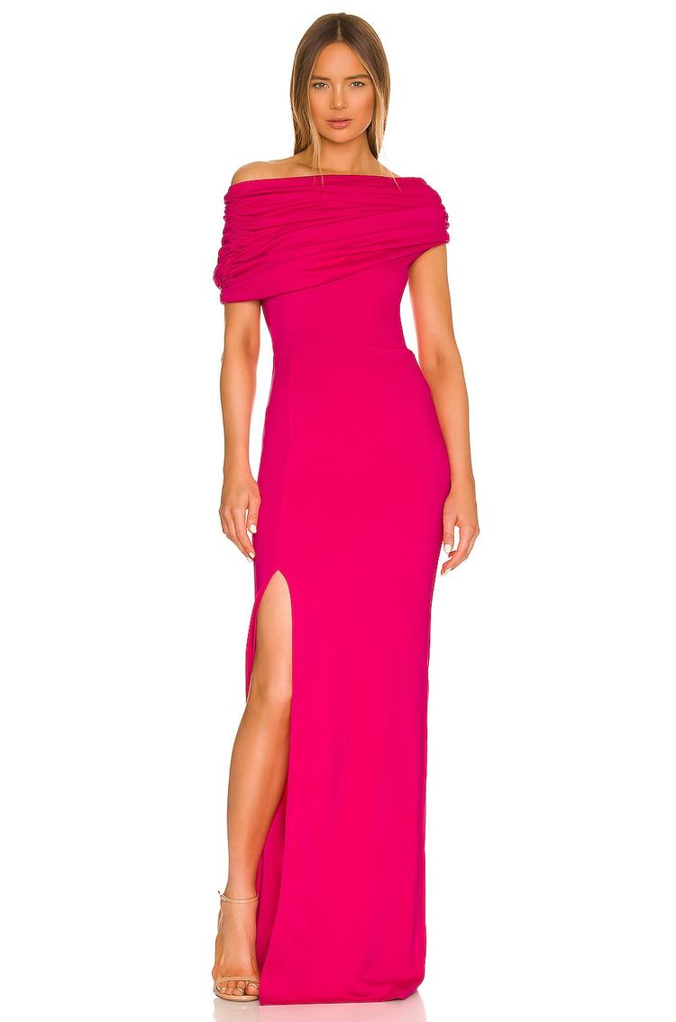 Bright pink satin fabric forms a sleek column silhouette with a fitted shape that skims the figure gracefully. The off-shoulder neckline and wide strap sleeve styling highlight the shoulders elegantly, while the bodice features draped detailing with a front twist and cut-out for added interest. A high side slit adds movement and allure to the maxi length hemline. The back includes a lace-up closure combined with a concealed zipper, enhancing fit and style. Ideal for cocktail parties, date nights, and formal occasions, this dress offers a sophisticated, polished look.