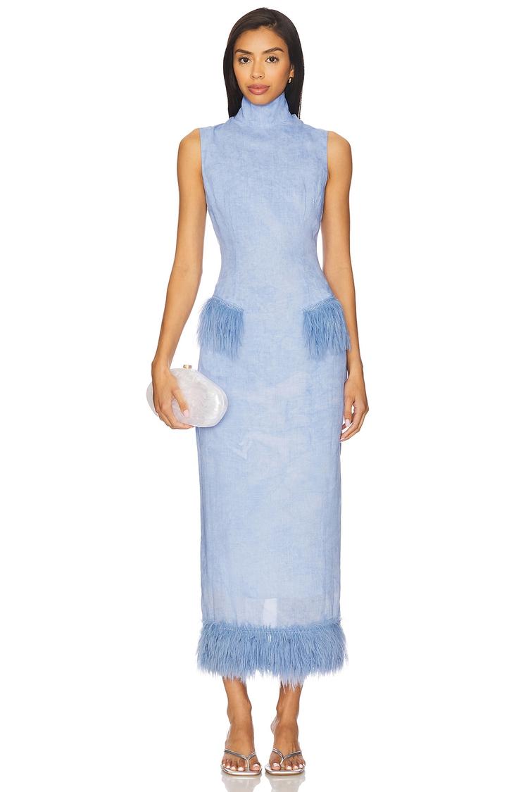 Soft linen and lyocell blend fabric shapes a fitted sheath silhouette with a refined high neck and sleeveless styling. Feather-trimmed pockets and hem add a touch of playful elegance, while the concealed back zipper and snap buttons ensure a sleek finish. The midi length and light blue hue make it an ideal choice for cocktail parties, date nights, or sophisticated evening events during spring and summer. Practical pockets enhance wearability without compromising the dress’s modern, sophisticated charm.
