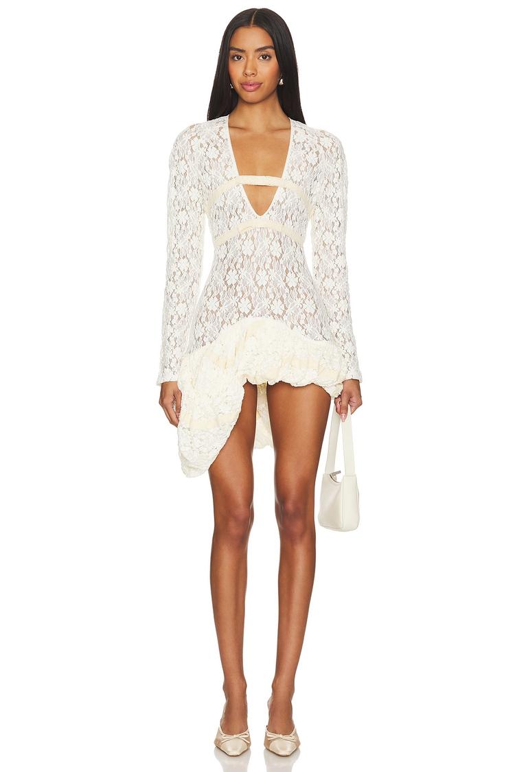 Soft white lace with a delicate draped design and tiered bubble hem defines this mini shift dress. The long sleeves and plunging V-neckline create an elegant yet sexy silhouette, while the stretch lace fabric offers a close, flattering fit. Perfect for warm spring and summer nights, this sheer dress is ideal for cocktail events, date nights, or a stylish night out. A snap button gusset lining and pull-on style add subtle functionality without compromising its romantic charm.