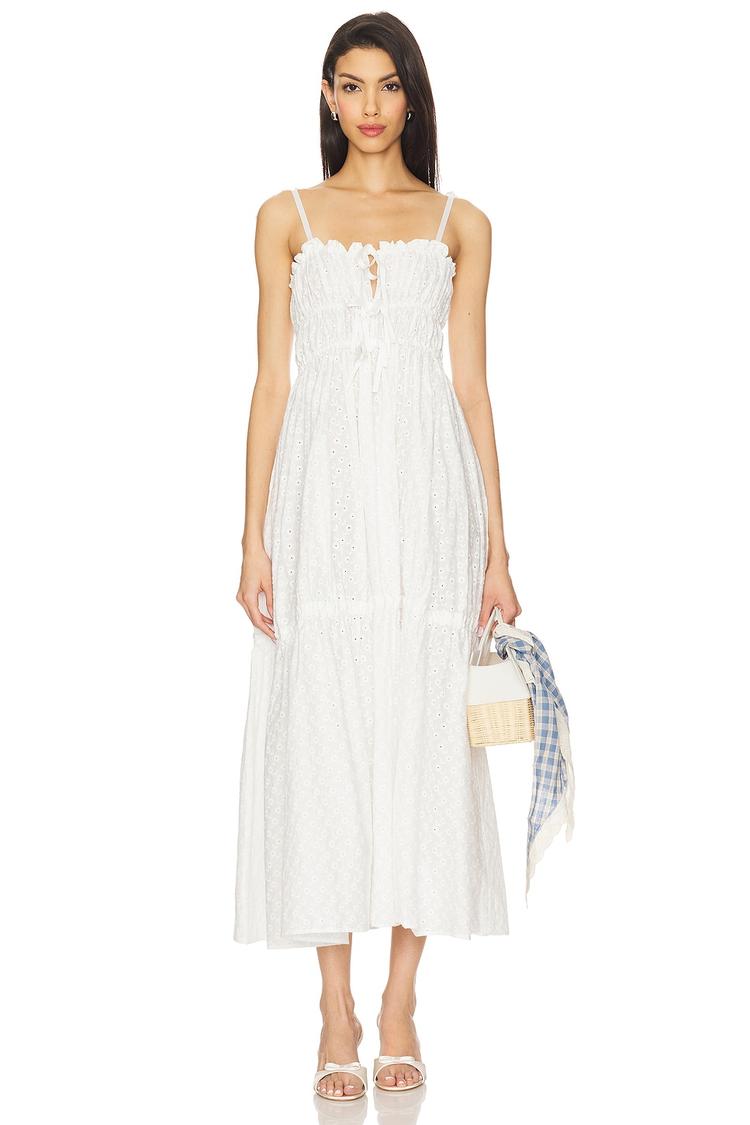 Soft cotton eyelet fabric and delicate floral embroidery create a breezy bohemian vibe in this midi-length A-line dress. The straight neckline with spaghetti straps and front tie bow add feminine charm, while the elastic waistband ensures a comfortable fit. Its tiered hemline flows gracefully for effortless spring and summer style, perfect for casual outings, brunch dates, or vacation days. The semi-sheer cotton fabric enhances its romantic feel, making it a versatile piece for warm-weather occasions.