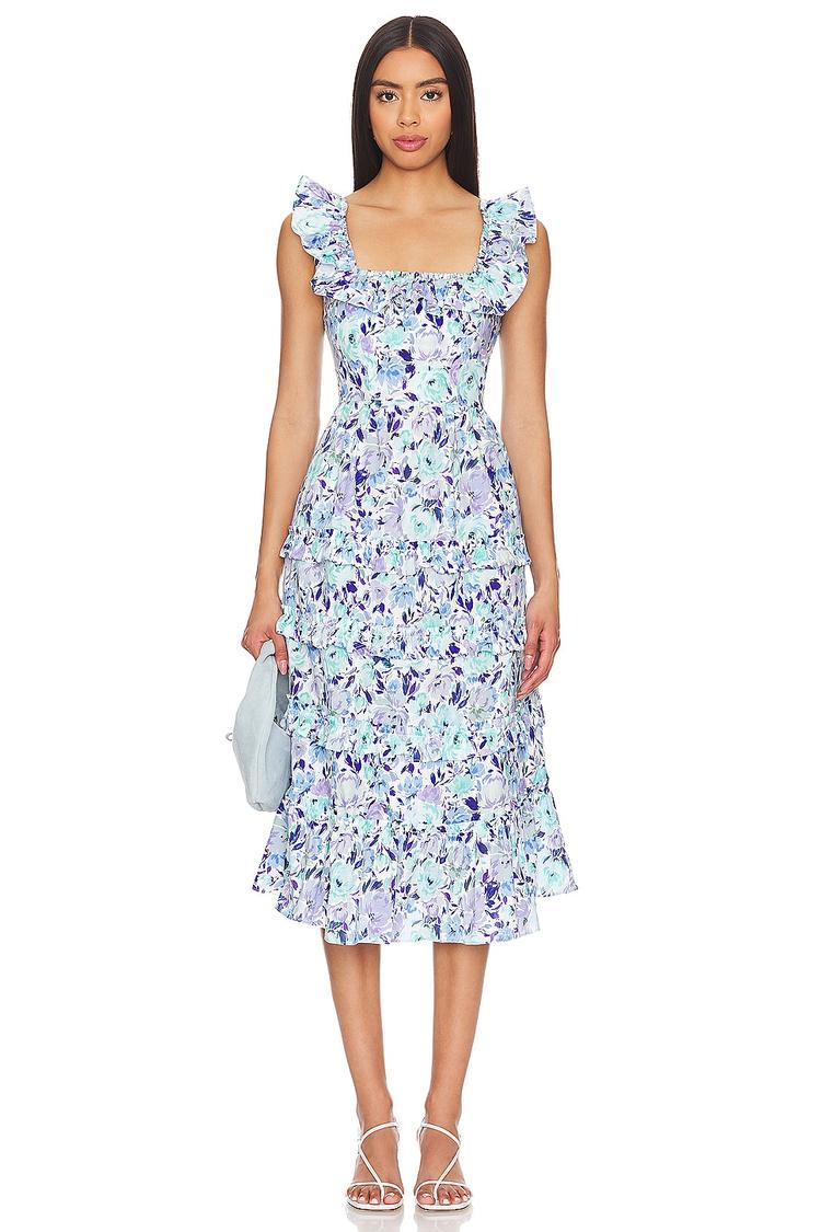 Soft matte light blue cotton poplin forms a fitted and flared midi silhouette adorned with an all-over delicate floral pattern in purple and white. The square neckline and flutter sleeves add romantic charm, while ruffled hems enhance the feminine flair. Functional side seam pockets and a concealed back zipper complete the design. Perfectly suited for spring and summer occasions such as brunch, casual outings, or date nights, this dress blends classic elegance with everyday comfort and style.