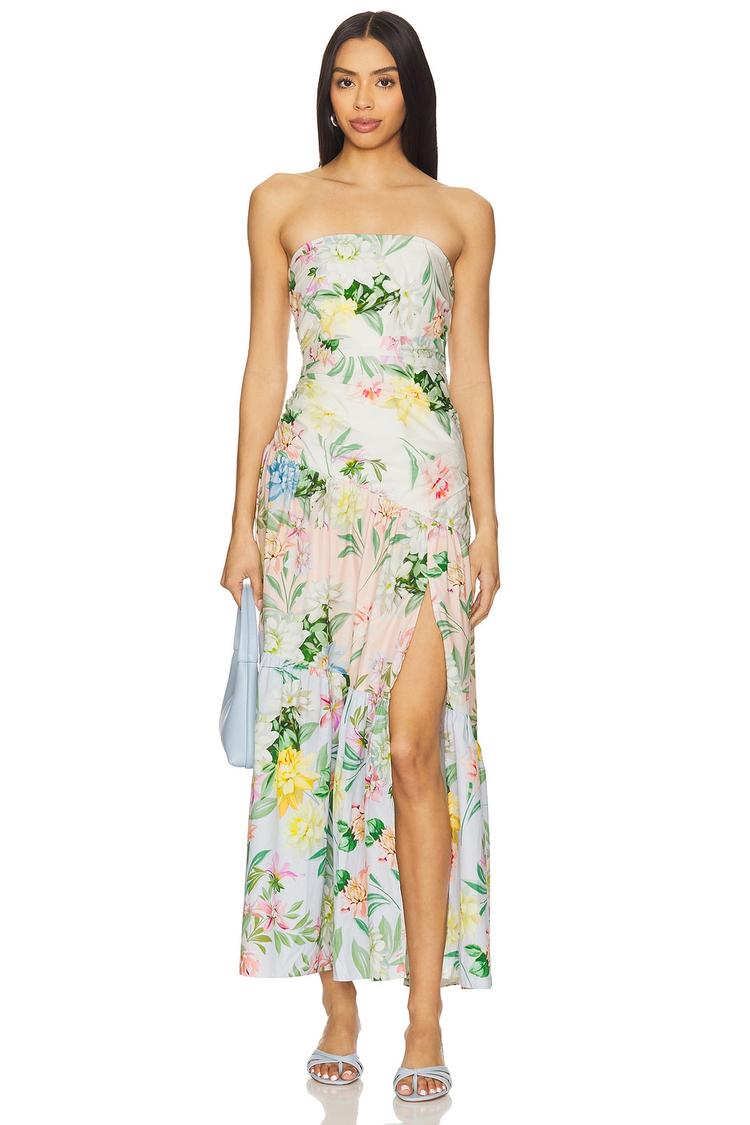 Soft cotton poplin and a strapless, fitted bodice with ruching create a romantic and breezy silhouette in this midi dress. The tiered skirt and side hem slit add feminine movement, while the vibrant floral print in multiple colours on a matte off-white base enhances its bohemian charm. Ideal for spring and summer, this versatile A-line dress suits brunch, date nights, or vacation days with effortless style and comfort.